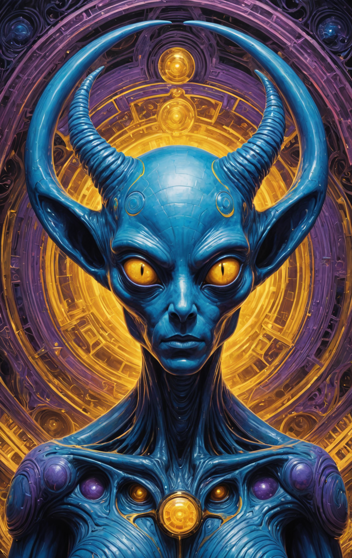 An award-winning digital art piece, redolent of the surrealism and futurism movements, that features a mysterious blue alien with yellow eyes and horns. The alien is the centerpiece of an ethereal vortex, swathed in darkness, with the interplay of shadows and highlights underlining strange patterns and creatures. The color palette majestically weaves blue, purple, and yellow, evoking an otherworldly aura. This art piece is featured in prestigious publications like Wired Magazine, SFX Magazine, Cinefex, and displayed in renowned galleries like The Louvre, Museum of Modern Art, and Tate Modern.