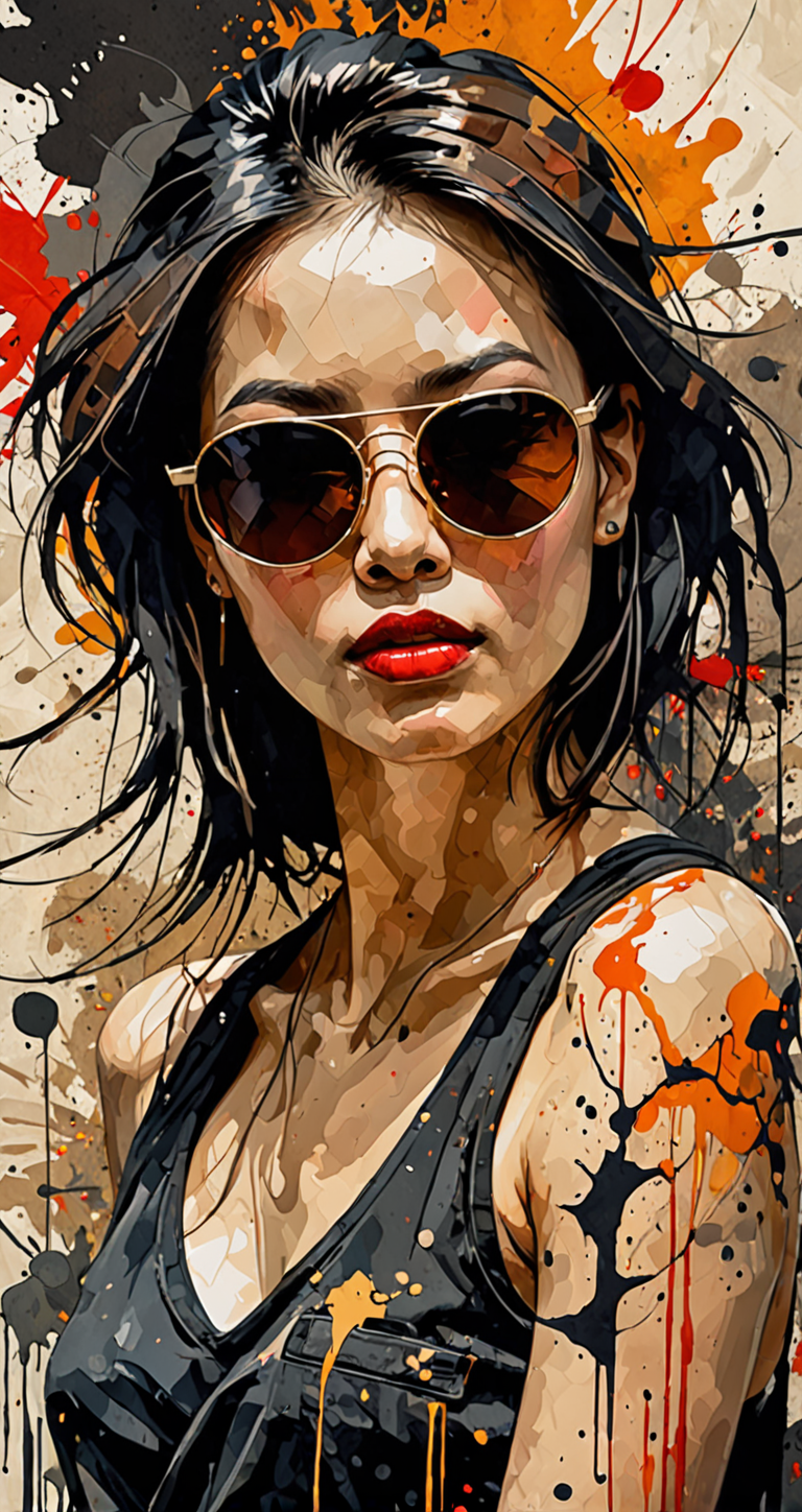 aesthetic, painterly style, modern ink, adult Asian girl, sensual, sultry, (punk retro ultra small hanging sunglasses), (dark blouse, tank top), expressive pose, urbanpunk, abstract texture multilayer background, vivid background, splash of paint, neo-expressionist, detailed background , Russ Mills, Ian Miller, urban, graffi, ,style of Anne Bachelier, <lora:add_detail:1>, halfbody portrait, frow below, cinematic, striking, posing