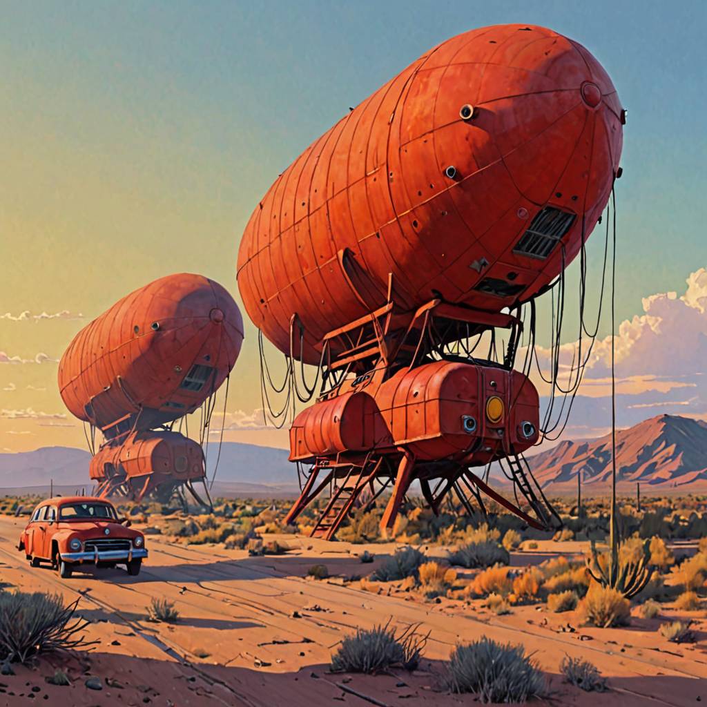 (desert:1.5) rusty a group of zeppelins (sunset:1.3) <lora:Simon_Stalenhag_LFTL_SDXL:0.5> Simon Stalenhag style Fire Engine Red,Orange Yellow