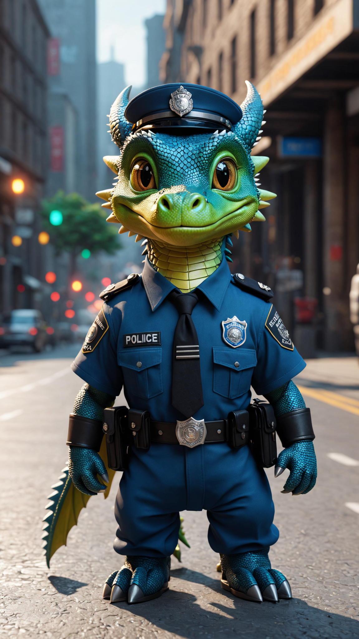 (small dragon ) wearing police uniform, centered image, maximum fidelity, ultra high detail, ultra HD, Panavision Millennium DXL2 8k professional RAW photography, luminous reflections, rtx on, subspace scattering, dynamic hdr tone mapping, volumetric lighting, screenspace reflection, Physically-Based Rendering, environmental lighting, maximal attention to correctness and detail