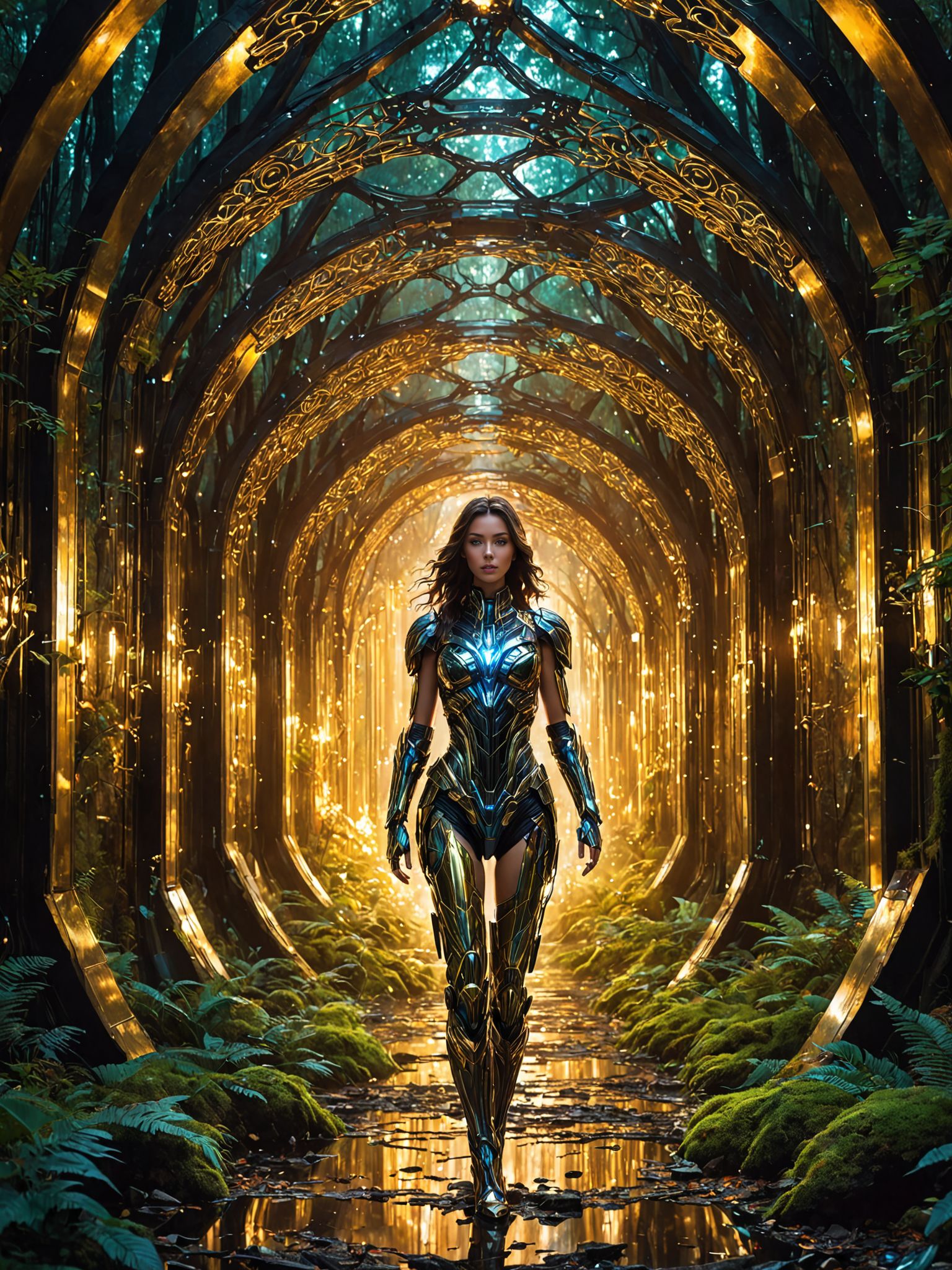 Generate an image girls emerging from a futuristic forest tunnel illuminated by a radiant light. Infuse the scene with an epic Transformers dark art aesthetic, incorporating intense glows, detailed elements, and a sense of masterpiece quality. Integrate galaxy and star motifs, with flames and fire adding a dynamic and captivating touch. Prioritize ultra-detailed realism while incorporating abstract elements, drawing inspiration from the style of Greg Rutkowski. Infuse the composition with surreal gold filigree, aiming to create an award-winning artwork that seamlessly combines intricate elegance with otherworldly beauty.