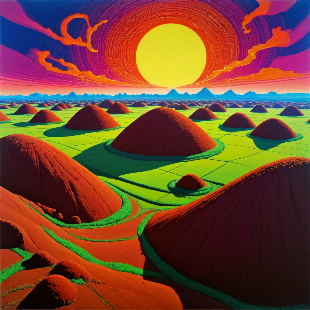 professional, surreal, landscape of a (The Chocolate Hills:1.3) from inside of a Chad, it is very Gutai Group and Enthralling, Dwarven field and Space in background, Summer, Simple illustration, Energetic, Ribbons, American Scene Painting, Neon Light, Circular polarizer, CMYK Colors, magnificent, intricate details, arthouse, 64K