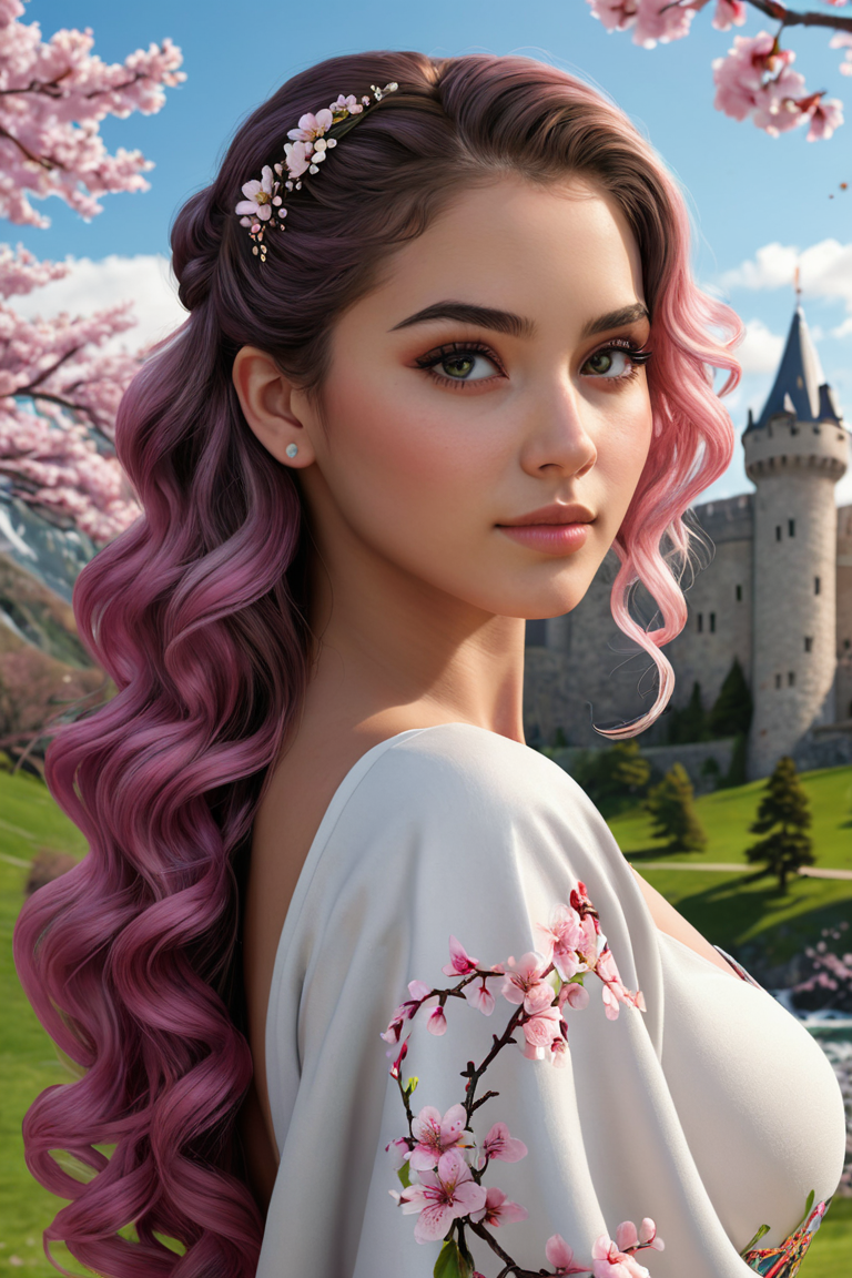 Physically based render, over the shoulder shot of a (stunningly beauty, beautiful young woman, 20yo, busty:1.3) , surrounded by Cherry blossom trees, sieging a Castle, chin of gorgeous and eyebrows of good-looking, Rainbow hair styled as Curly, from inside of a Resort, at Overcast, in focus, Realistic, Techwear, Bloom light, F/14, realistic elegant face, realistic and detailed