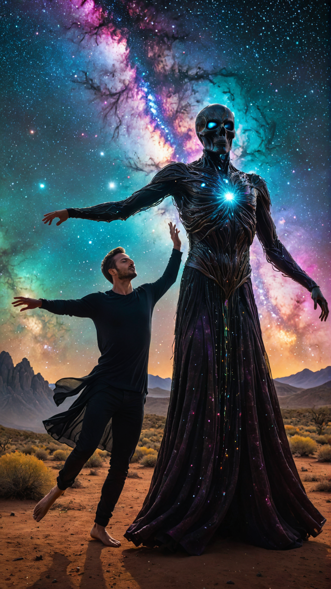 8k award winning photo of a man,(dancing (alongside:1.5) a wraith),a husk whose soul is ascending from it's body,light shining down upon them both.,a great colorful galaxy seen in the distant background,<lora:xl_more_art-full_v1:0.7>,