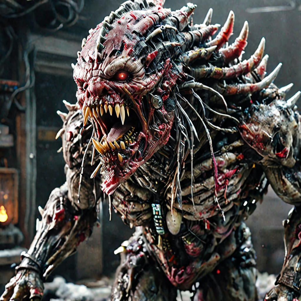 n the cyberpunk world, a transformed predator, with cybernetic enhancements, open mouth, full body, perfect composition, hyperrealistic, super detailed, 8k, high quality, trending art, trending on artstation, sharp focus, studio photo, intricate details, highly detailed, dust particles, <lora:fx-monsters-xl-meatsack:1> fx-monsters-xl-meatsack solo