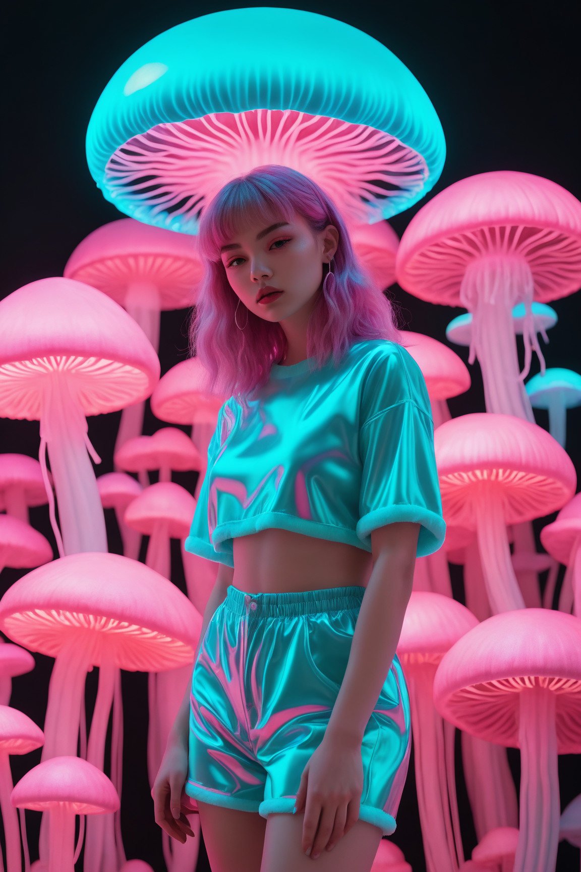 neon outlines art, a fasion show, cutecore, vaporwave, glowing, fluffy, fuzzy, iridescent, colorful, mushroom and jellyfish-themed, pink and teal color theme