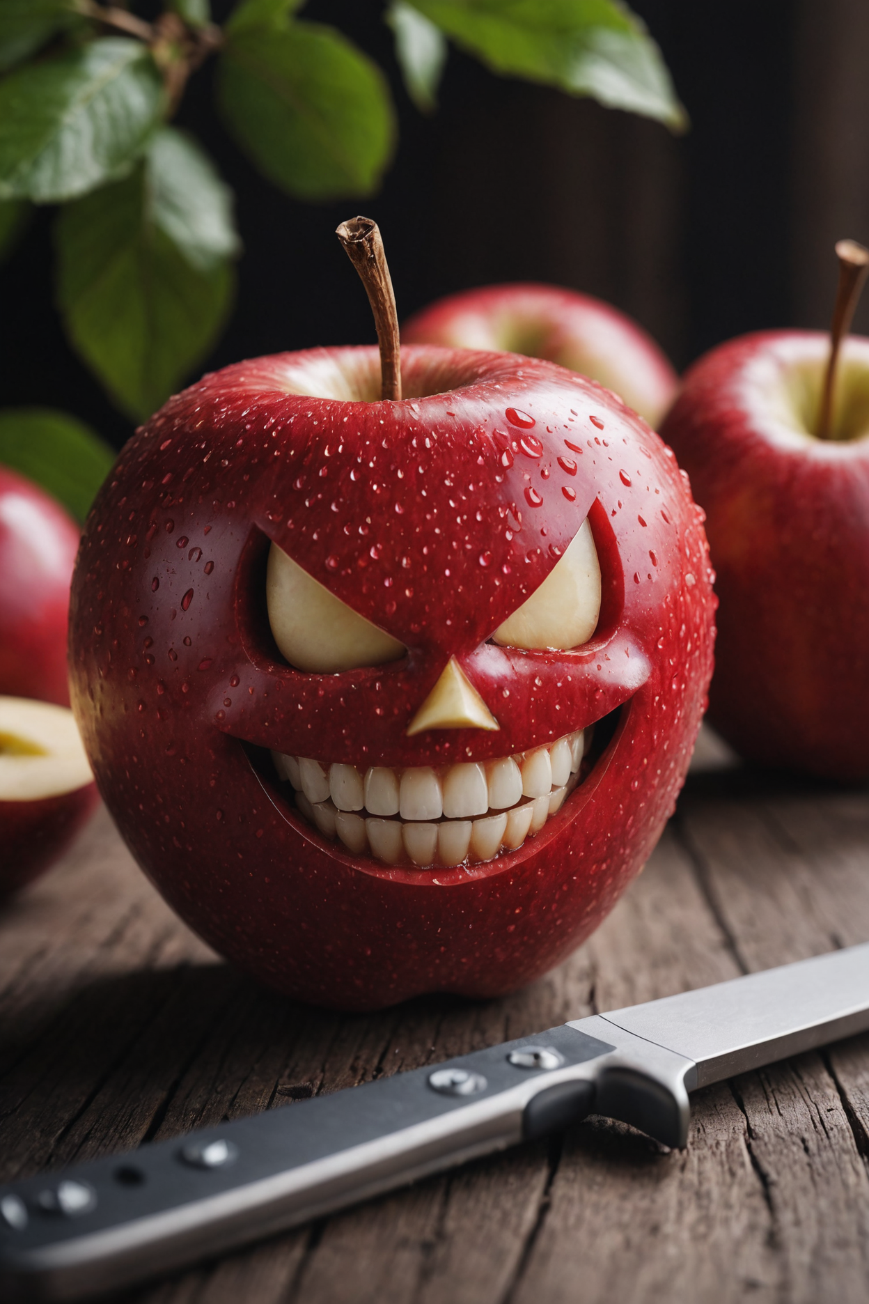 cinematic photo evil apple,evil smile,knife on table,fruit,macro,head shot . 35mm photograph, film, bokeh, professional, 4k, highly detailed