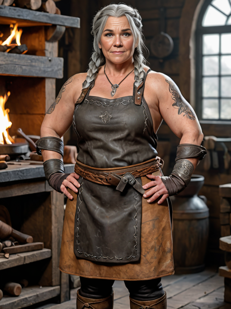 Character desing of a (fantasy female dwarf:1.1) blacksmith, <lora:NaturalBody:0.4> (short, large, muscled, beefy, yoked, obese, stocky:1.7), very long braided grey hair, messy, fifty years old, leather apron, gloves, runic tattos, artisan outfit, blacksmith workshop, masterpiece, 4k resolution, volumetric lighting, <lora:add-detail-xl:0.3> extremely detailed, award wining art