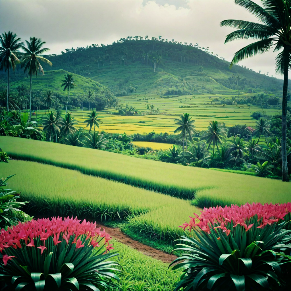 studio, intricate details, landscape of a (Tropical Island:1.3) from inside of a Eswatini, it is very Aesthetically Pleasing and Fatigued, lush field and flower field, at Overcast, (art by Lucien Pissarro:0.7) , (Victorina Durán:1.2) , Guilty, Serial Art, short lighting, 80mm, Cathode tube, bloom, Cross Processing, extremely beautiful, extremely detailed CG Unity 8k wallpaper