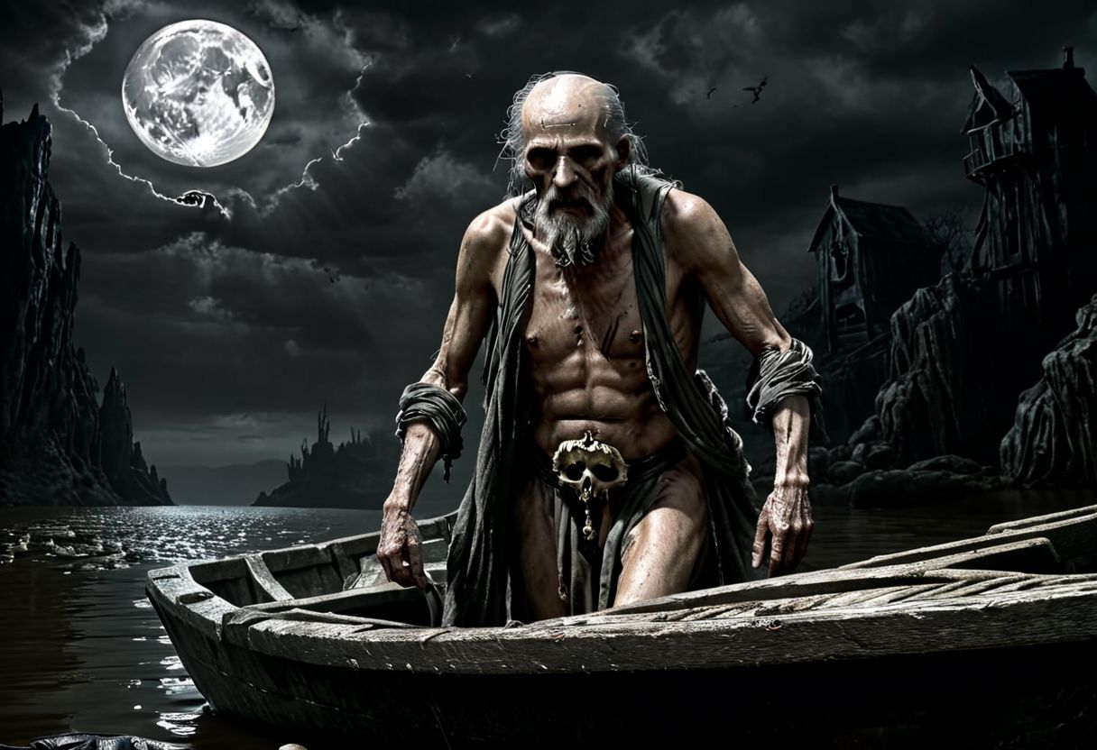 Charon, a gloomy old man in rags, in a boat with 3 souls of the dead, the native river Styx, mooncryptowow