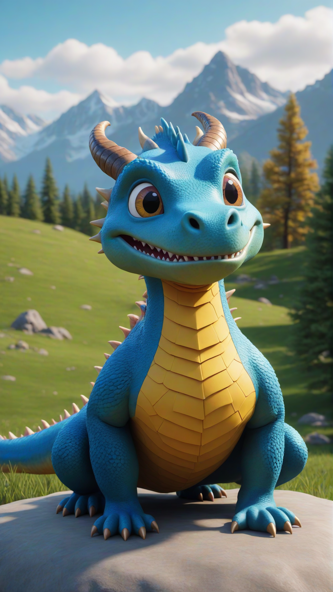 Mrdragon,cartoon dragon,cuddly,3D effect,look at viewer,outdoor,(full body):1.3, Background\(Snowy mountains,grassland,sky,tree,mountain,cloud,water\), masterpiece,best quality,unreal engine 5 rendering,movie light,movie lens,movie special effects,detailed details,HDR,UHD,8K,CG wallpaper,