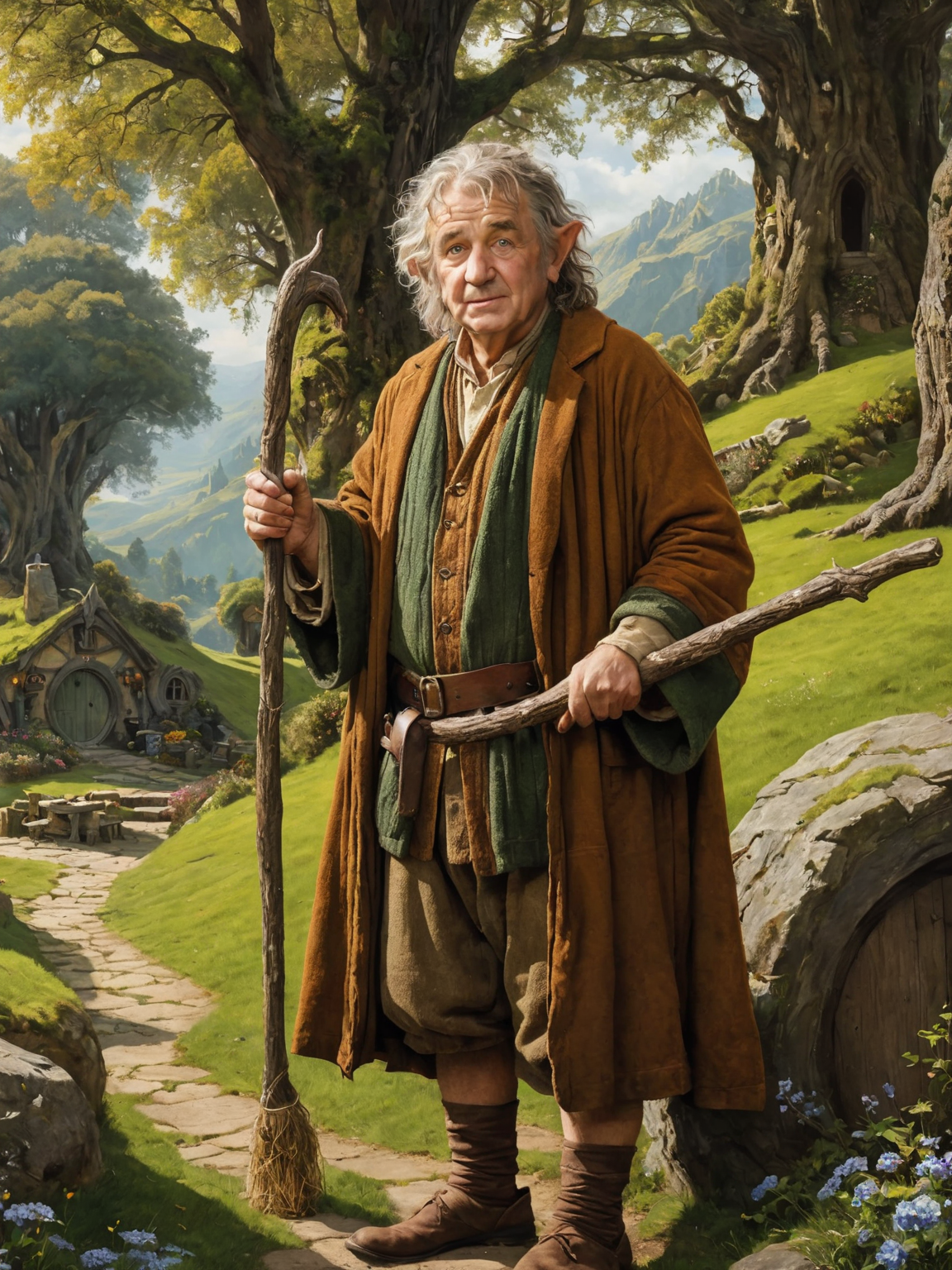 Bilbo's Recruitment by Gandalf, This event marks Bilbo's introduction to the adventure. Gandalf's arrival and the unexpected party with the dwarves challenge Bilbo's comfort and ordinary life, setting the stage for his transformation. Medium - Oil on canvas. Composition - A cozy, vibrant scene. Gandalf stands towering on the left, with a playful yet mysterious expression, holding his staff. Bilbo is smaller, right of center, looking up with a mix of apprehension and curiosity. Color Palette - Warm and inviting hues dominate the Shire â greens of the grass and trees, yellows and browns of the hobbit hole. Mood - An air of unexpected adventure looms, contrasting with the serene Shire life.