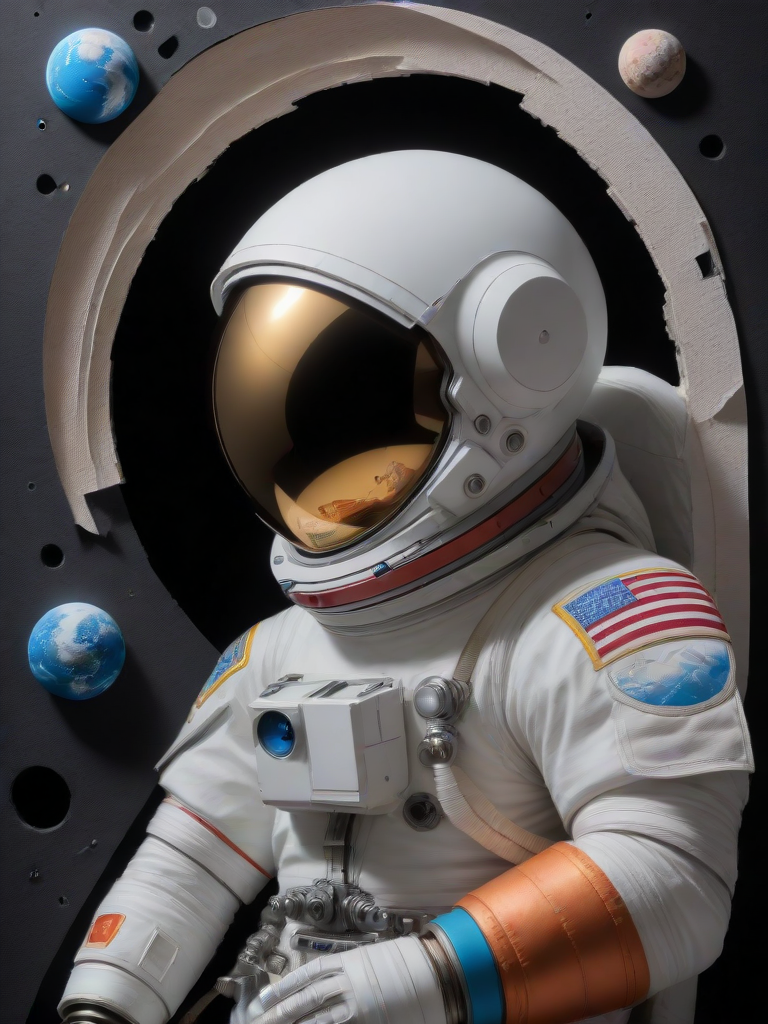 astronaut, Papercut collage, Mixed media, textured paper, overlapping, asymmetrical, abstract, vibrant, mark brooks and michal lisowski,