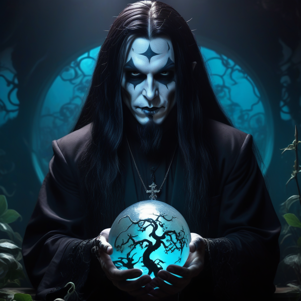 Orchid, (spooky black scary creep:1.44), big flower creepy bishop background, long hair wearing obsidian power crystal ball plants colored tattoos lighting short shadows lighting, fantasy concept artists art
