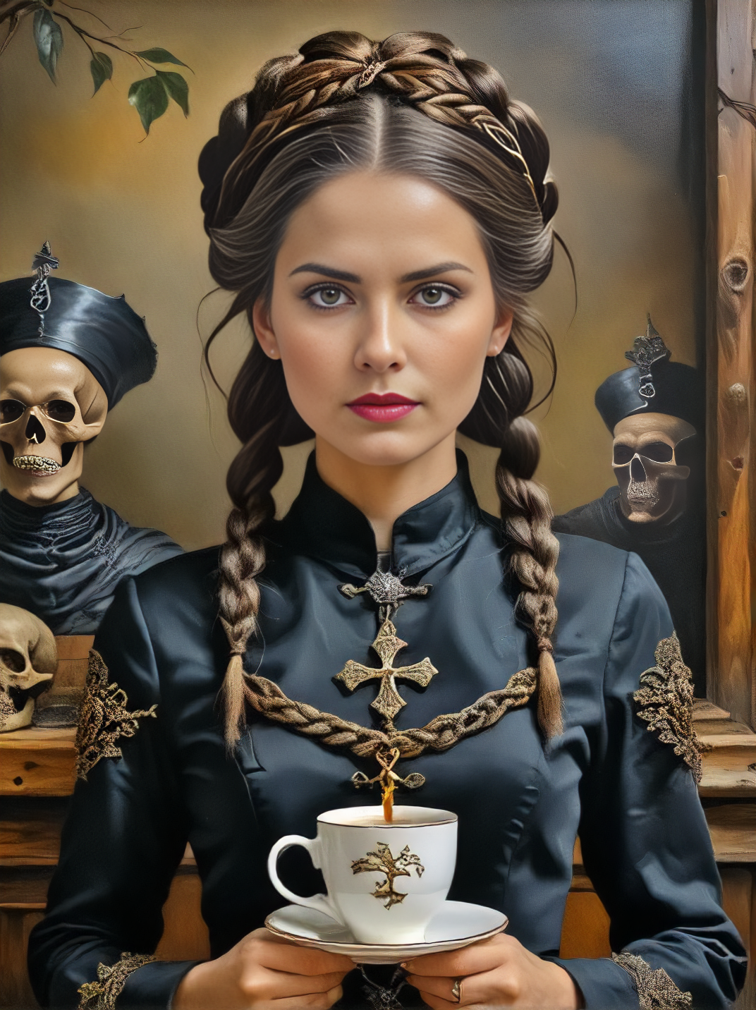 Barista, Braided crown hairstyle, brunette, gray eyes, Posing as if carrying something heavy, Macabre style, dark, gothic, grim, haunting, highly detailed, kevin sloan and alberto giacometti, <art by mooncryptowow:0.6>, <lora:xl_more_art-full_v1:.65>, <lora:Retro_Illustration:.65>, <lora:sdxlInkpunkstyle_v01:0.75>, <lora:xl_yamer_style-2.0:1>,
