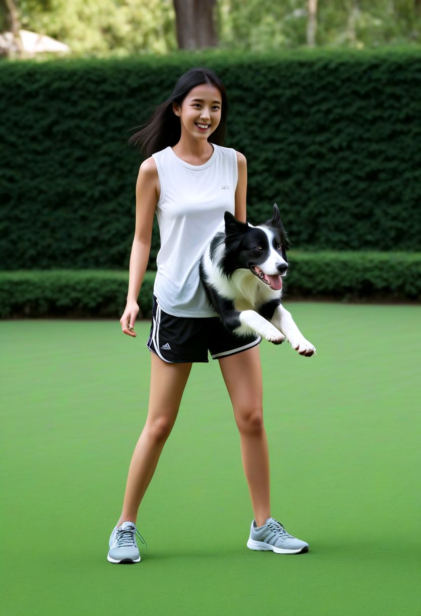 1girl,, Indonesian girl, black long hair, shining bright black eyes, droopy eyes, outdoor, park, lawn square, shorts, sleeveless shirt, sneakers, The shape of the nipple stands out, border collie, play with dog, playing with the dog very happily, smile, braless, Wearing <clothes that make sense with Braless>, (high quality:1.4), (high resolution:1.3), (incredibly detailed:1.28), cinematic lighting, masterpiece, perfect anatomy,