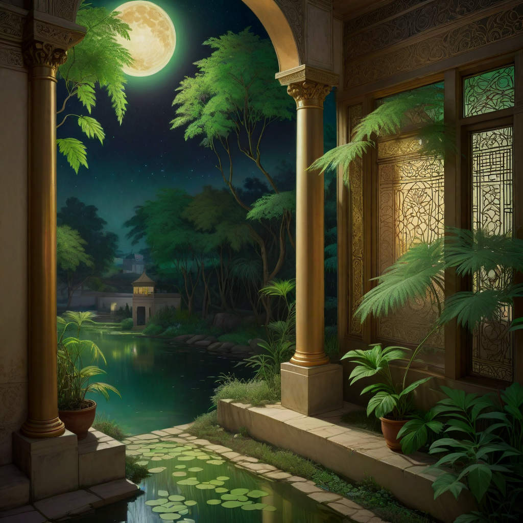 (scene art by Mary Cassatt:1.3) and (Susan Seddon Boulet:1.0) and (Ikenaga Yasunari:1.2) , character art, awardwinning, Abstract Art, behance, landscape of a Green and Brown (Bahrain:1.3) from inside of a Synagogue, it is very Traditional and Wispy, lush flora and roots, Moon in the night, Realistic, Cosy, hyper detailed, side light, F/1.8, CineColor, ethereal magical atmosphere, Magic the gathering, extremely beautiful, adobe lightroom