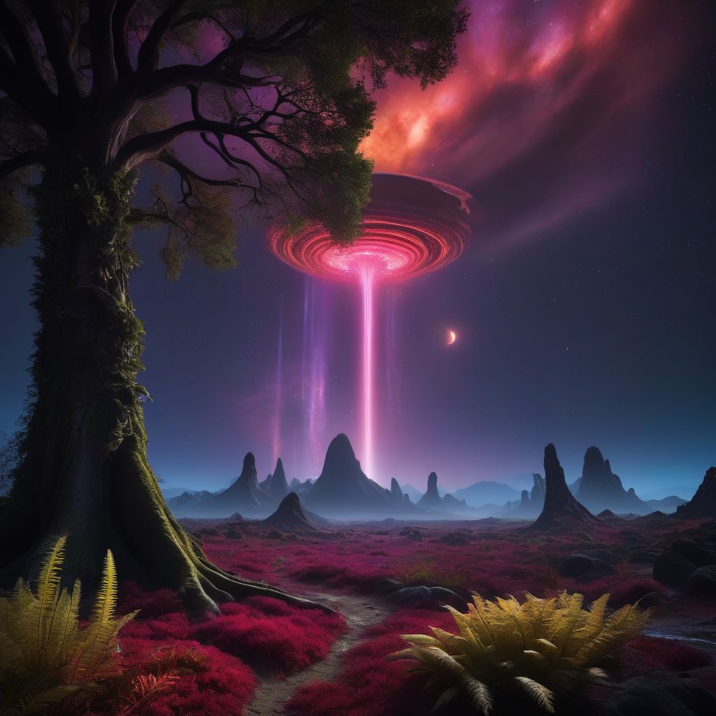 (masterpiece:1.4), best quality, ultra high res, cinematic lighting, 8k uhd, soft light, high quality, cinematic lighting, (detailed), (intricate), (8k), (HDR), (wallpaper), (cinematic lighting), (sharp focus), (realistic:1.3), finely detailed, quality, (masterpiece:1.2), (photorealistic:1.2), (best quality), ((masterpiece, best quality)), trending on artstation, Explore the enchanting exoplanet of Verdantonia, a realm bursting with life and luxuriant landscapes that defy imagination. Immerse yourself in the vibrant symphony of colors and fragrances that fill the air as you step onto the alien soil. The terrain gently undulates, covered in a velvety carpet of bioluminescent flora that pulses with rhythmic energy. The ground beneath your feet is a mixture of soft mosses and springy vines, responding to your touch. Towering crystalline trees rise towards the sky, adorned with phosphorescent leaves casting an ethereal glow. Encounter exotic flowers with color-shifting petals and surreal, living sculptures formed by the diverse array of plant life. Colossal fern-like structures and bulbous fungi emitting gentle bioluminescence create a surreal ambiance in the shadows. Above, the sky is a masterpiece bathed in warm crimson hues emanating from the red star. Wispy clouds in gold and lavender drift lazily, casting ever-changing shadows on the vibrant landscape. Witness breathtaking sunsets as the red star dips below the horizon, enveloping the expanse in a warm twilight. The air resonates with the harmonious symphony of alien wildlife - melodious birds with iridescent feathers, and distant calls of unseen creatures. Bioluminescent insects dance in the air, leaving trails of light that crisscross the darkening sky. Verdantonia is a testament to the cosmic beauty and diversity beyond our familiar celestial boundaries. Stand amidst the exuberant vegetation, surrounded by the sights and sounds of an alien world, and feel a profound sense of awe and wonder at the limitless possibilities of the cosmos.