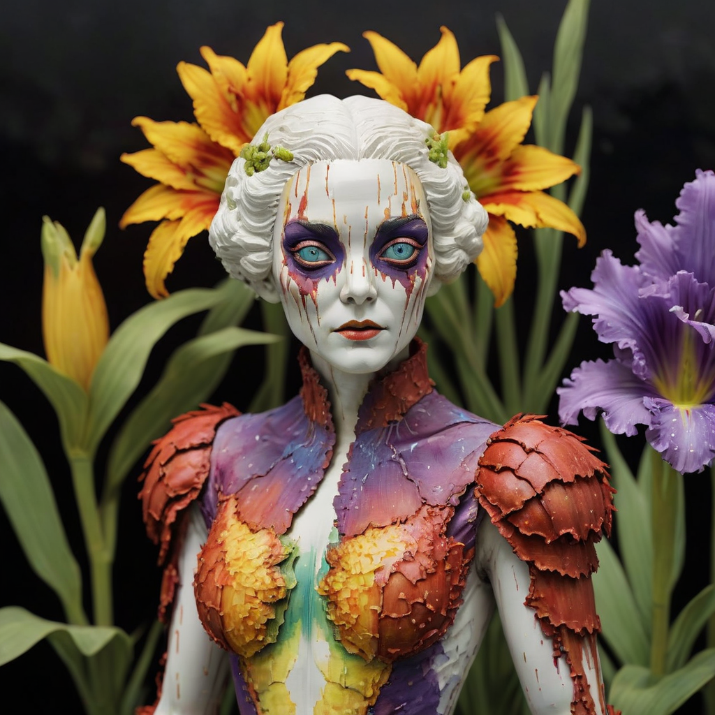 a fantastical figure in an avant-garde costume. The character stands against a simple gray background that accentuates their attire. The costume is in vivid shades of crimson and burgundy, featuring expansive ruffled collars and layers that resemble the petals of an exotic flower. The garment is embellished with sparkling sequins and intricate patterns that resemble veins of leaves or flowing water. The figure's face is painted in a dramatic style with pale skin, accented by dark, expressive eyes and lips, framed by a bold makeup design that complements the theatrical outfit. The figure's pose is elegant and poised, with one hand gracefully touching the waist and the other slightly extended, giving a sense of movement and drama.. In the center, a red crab with striking purple spots and delicate blue highlights stands on a gray, uneven surface resembling sand. The crab's body is adorned with a cluster of vibrant purple gladiolus flowers, replacing the typical shell. Each gladiolus petal is richly hued in shades of purple with darker striations, and in the center of each flower is a realistic blue eye with a bright green iris, adding a surreal quality to the image. The crab's eyes are not visible, further anthropomorphizing the flowers as part of the creature. The background is the off-white color of the paper, allowing the subject to stand out. The watercolor technique showcases gradients, washes, and wet-on-wet effects, with a gentle shadow beneath the crab to suggest its presence on the surface. <lora:VoxelXL_v1:1> voxel style A detailed digital painting of a character that resembles a classic horror movie monster standing in a lush garden. The character has a pale, scarred face with deep-set eyes and messy white hair, giving an eerie and uncanny expression. It wears a dark, tattered suit that seems worn out and dirty. The garden is filled with vibrant green foliage and various flowers, predominantly yellow sunflowers and some red ones, against a backdrop of a dark wooden fence. The color palette consists of rich greens, bright flower hues, and dark tones for the suit, under a daylight setting.