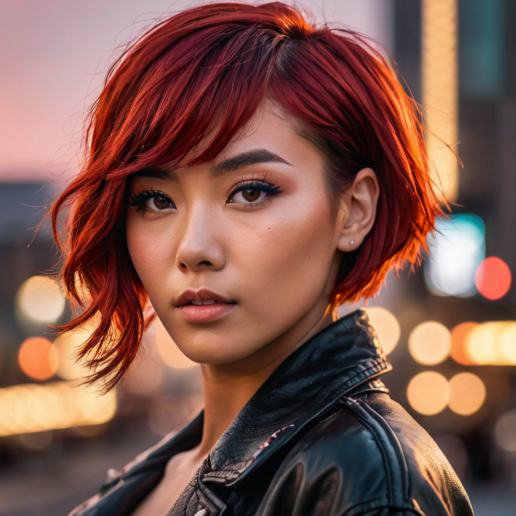 Medium close-up digital painting of a 23-year-old Japanese woman with a vibrant red pixie cut, side-swept bangs. Urban skyline at sunset reflects her edgy, modern street style. Dynamic pose, neon lights highlight her hair. Professional model photography, high-resolution 4K.