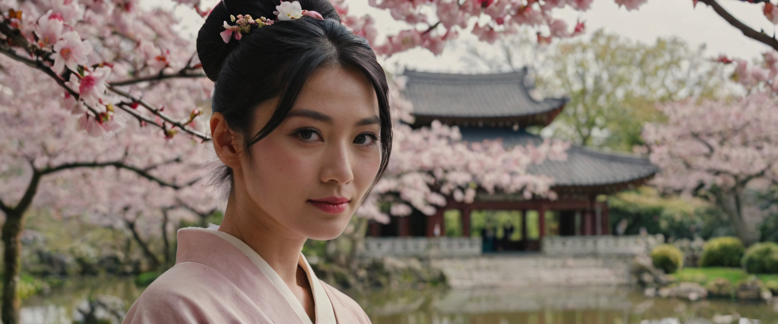 Cinematic still of a 23-year-old Japanese woman with jet black hair in a traditional high bun, adorned with kanzashi. In a serene historical drama setting, she stands in a tranquil temple garden, with cherry blossoms gently falling around her. Soft diffused light with a hint of pink from the cherry blossoms creates a calm and reflective mood. beautiful face, (feminine:1.4), (elegant:1.3), (beautiful eyes:1.5), beautiful lips, makeup, lipstick, (smile:1.2), looking at viewer