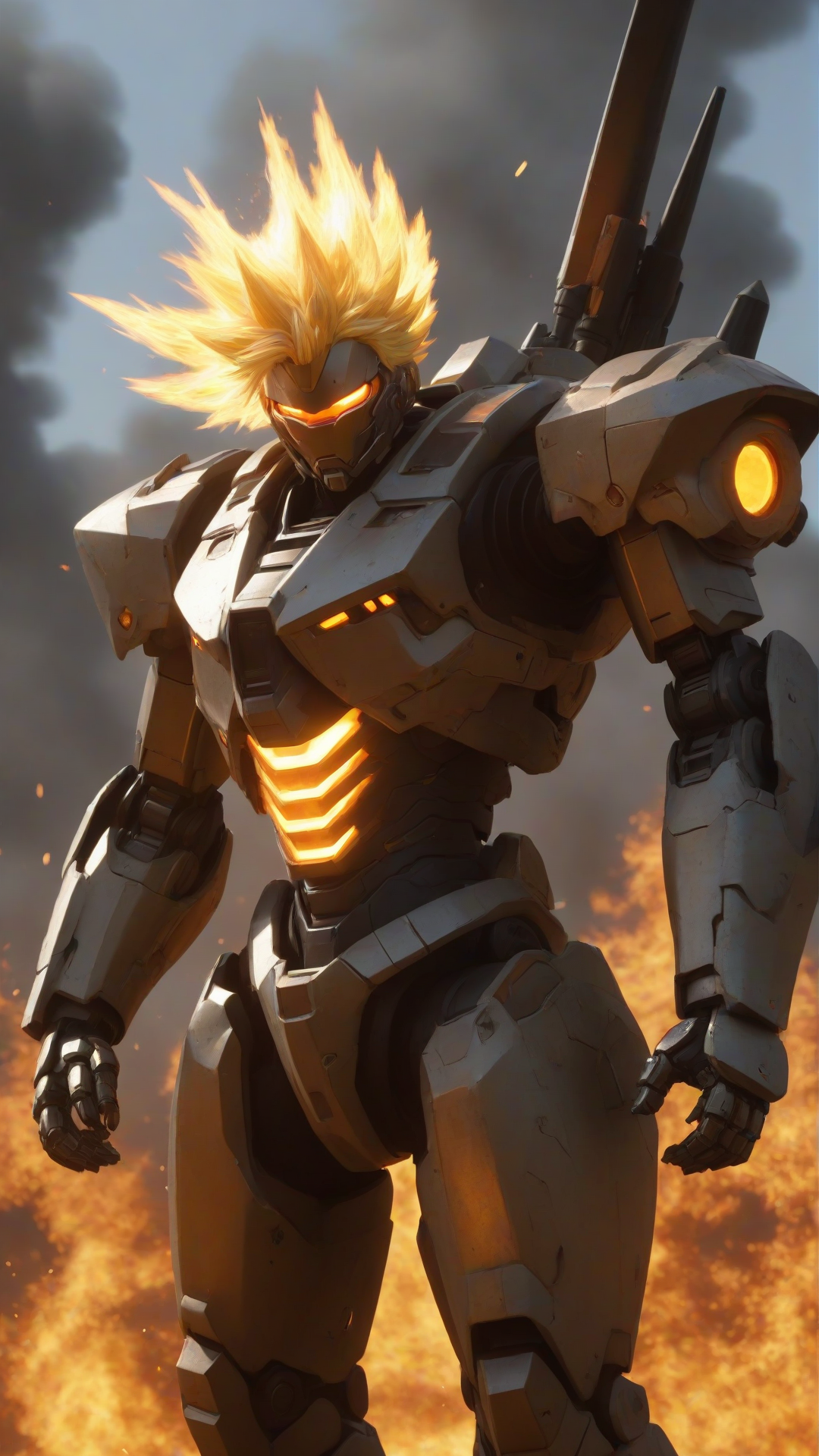 Mecha,1boy,blonde hair,breathing fire,burning,destruction,embers,explosion,fire,flame,male focus,molten rock,solo,spiked hair,standing,