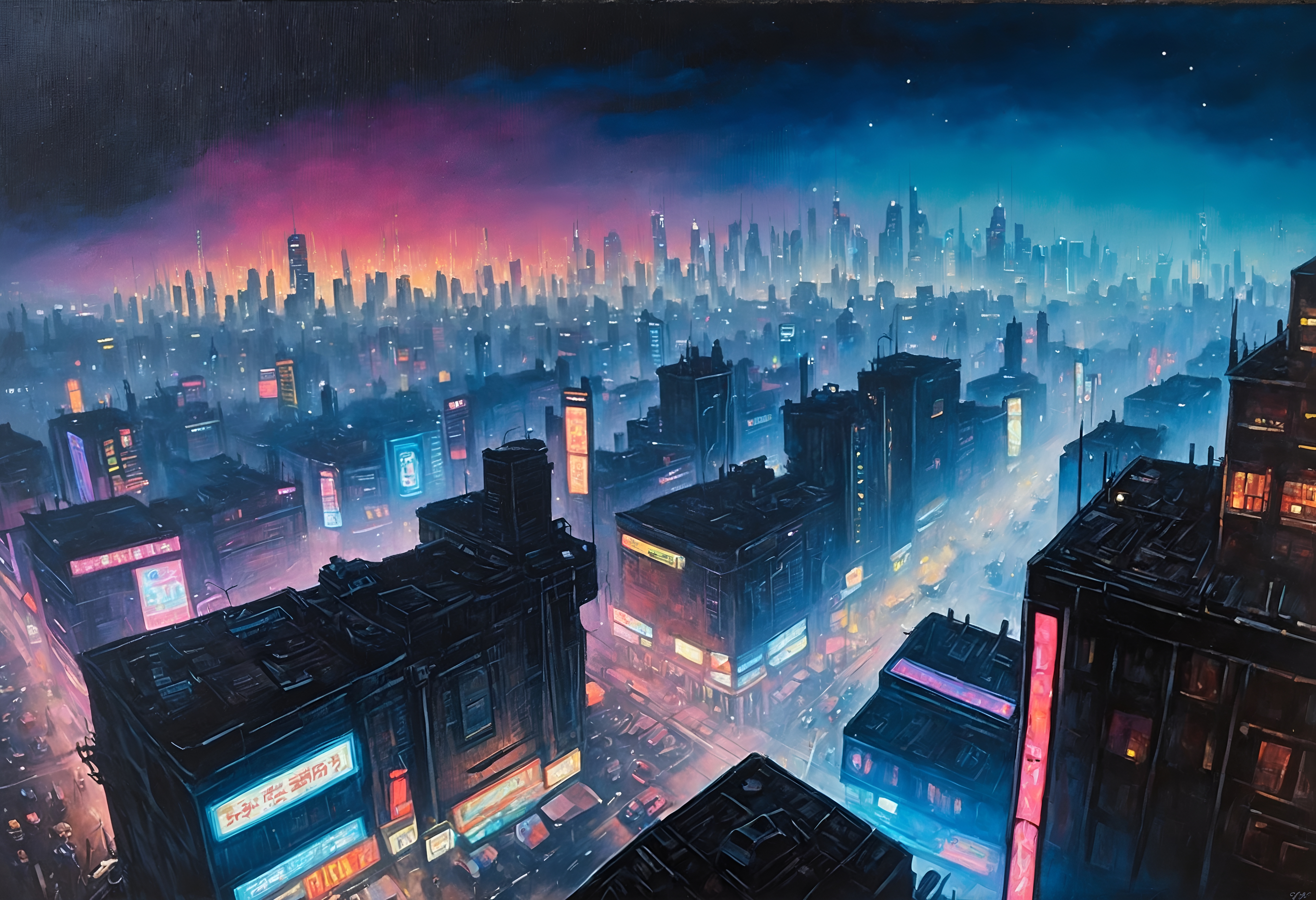 acrylic painting on canvas, birds eye view, rundown cityscape, smog, neon lights, night time, bladerunner style, cyberpunk, bldr, <lora:SDXL\bldr:1.0>