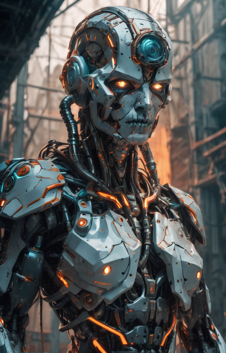 80mm raw, lightroom, professional photo (breathtaking:1.25), (dark magic, grimdark, creepy tale:1.15), cyborg, white and metallic body, detailed pipes, battle scene, (dynamic pose, contrapposto:1.3) (intricate details), (hyperdetailed), 8k hdr, high detailed, lot of details, high quality, soft cinematic light slate gray, cinematic colors, glowing,(teal and orange:0.7)