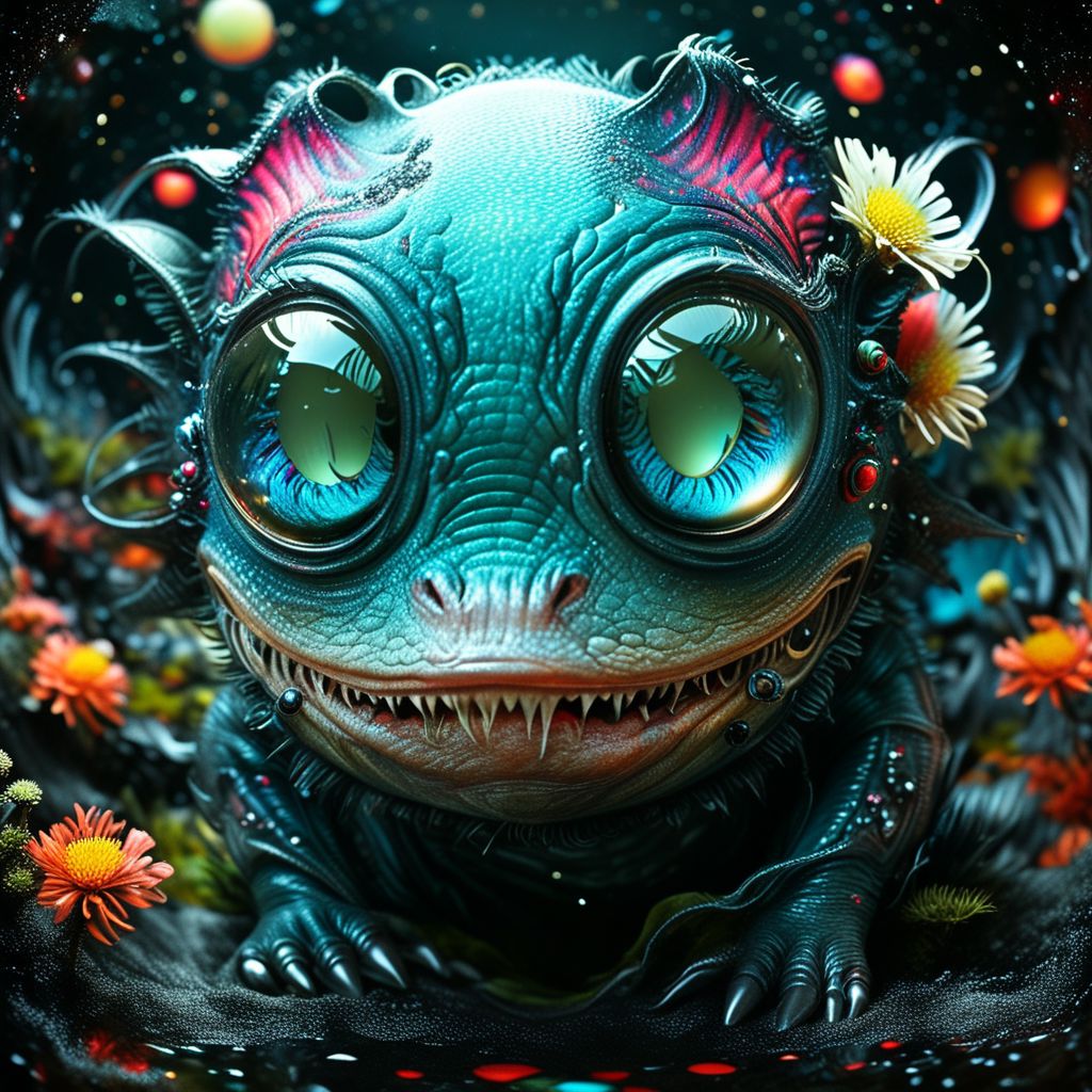 A cute space creature reminiscent of Dr. Suess and HR Giger, furry, colorful, vivid, fish-eye lense view, colorful alien world, carnivorous flora, multiple moons,