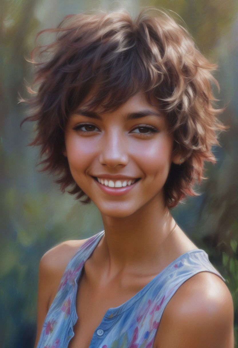 <lora:GiganticBreastsXLv1:1>, ((oil painting)), 1girl, Short-haired Spanish hippy goddess-girl, tanned skin, ((loose and skimpy translucent mostly-grey floral hippy summer-dress with extremely low-plunging front)), (dropped armholes), (side-boob), ((navel)), cheeky happy smile, ((dimples)), (((Red-textured messy short dark-brown pixie-cut hair))), (tubular breasts), sunny evening, Intricate textures, (high detailed skin:1.5),