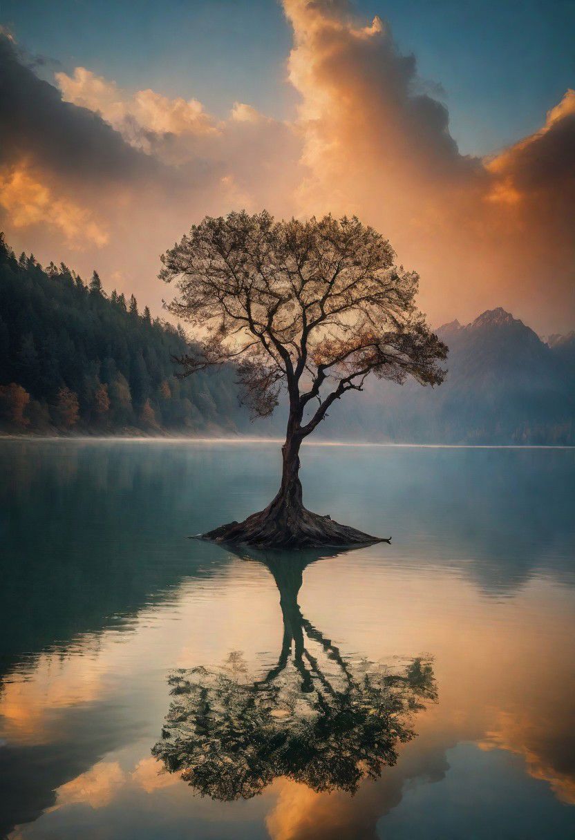 a lone tree in the middle of a body of water, breath-taking beautiful trees, breath - taking beautiful trees, autumn tranquility, very beautiful photo, perfect composition artem demura, national geographic photo, beautiful reflexions, beautiful photography, breathtaking composition, beautiful lake, nature wallpaper, national geographic photography, beautiful serene landscape, beautiful iphone wallpaper, amazing composition