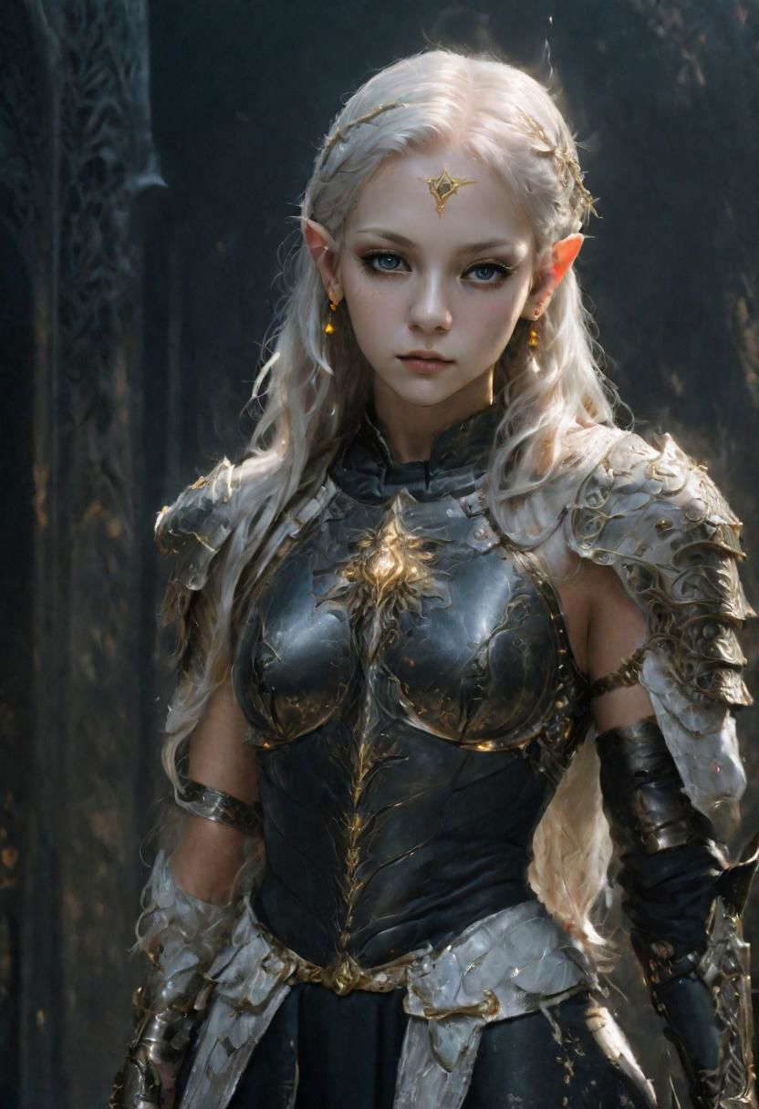analog film photograph of the high queen, an elf female of unearthly beauty, very long straight white hair, very pale pink skin, light grey eyes, (natural ears:1.2) mysterious smirking expression, looking down at the viewer, wearing (intricately decorated Milanese black (full cuirass) plate armor:1.4), intricately decorated with a damask, gold inlay, (brandishing a glowing sword pointed at the viewer:1.9), elf queen, full body shot, 1girl, GLOWING STYLE
