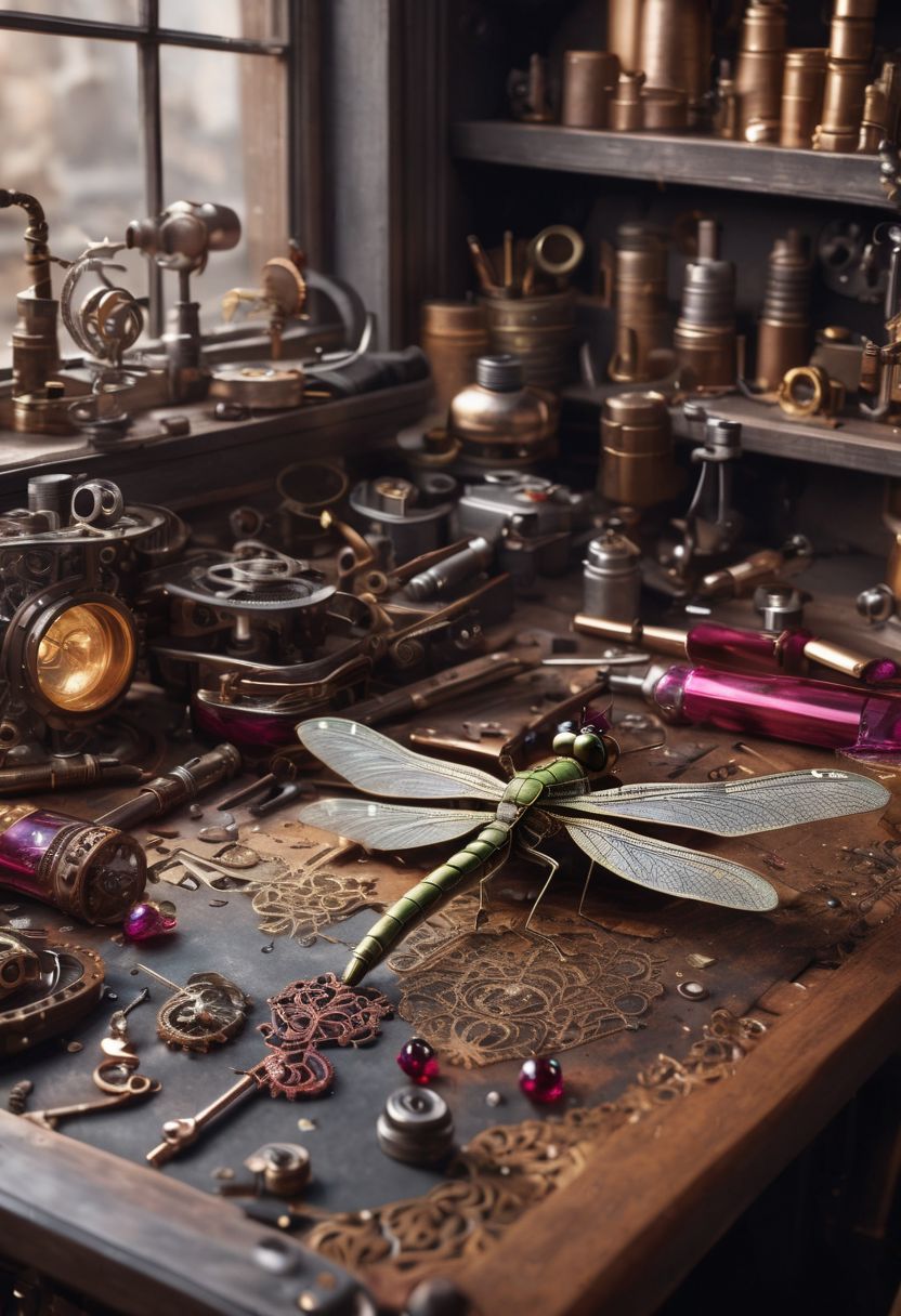 Steampunk Jeweled Metallic Ruby and Copper Dragonfly, on a Roll Top Desk, in a Messy and Disorganized Workshop surrounded by small tools and spare parts, (More Details:2), (photorealistic:2), (intricate and beautiful:3), (highres:1.5),(sharp:1.5), (Maximum Resolution:3)