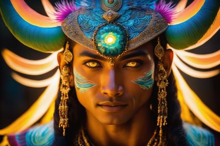 Detailed close-up photo of an exotic god realm creature's glowing eyes, (subtle reflections of its realm:0.6), vibrant bioluminescent light colors and intricate patterns, surrounding luminescent hair detailed, capturing the essence of a peaceful god realm full of radiant light, EOS R5, Canon RF 85mm, f1.2, national geographic photography