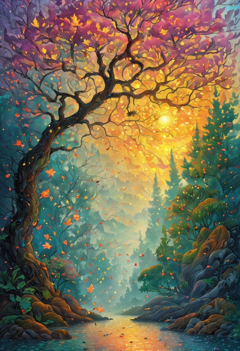 Bohemian Art, Low Angle, Yumei Style, Best Quality, High Resolution, 8k Very Beautiful, Mesmerizing Fireflies, Maple Leaf Floral Vibe, Vibrant Godray Effects Realistic, Super Detailed Vibrant Glowing Rose Petals , glowing leaves, dreamy wonderland gardens and playful firefly slutty are inspired by Yuumei's huge bustle of extremely detailed scenes, the overall style is reminiscent of fantasy art, focusing on intricate details and a sense of wonder. This painting is a true masterpiece, demonstrating the artist's extraordinary skill in capturing the beauty and majesty of nature in a surreal and imaginative way. soft colors, <lora:Paul_Signac_Neo-Impressionist_dotted_paintings_Pointillism:1> ah_signac <lora:TQ_-__Kids_Storybook_Illustrations_XL-000006:0.2> <lora:ral-lava-sdxl-v2:0> ral-lava <lora:artivelyTREETTREET_SDXL_V1:1.2> Arttrttrt