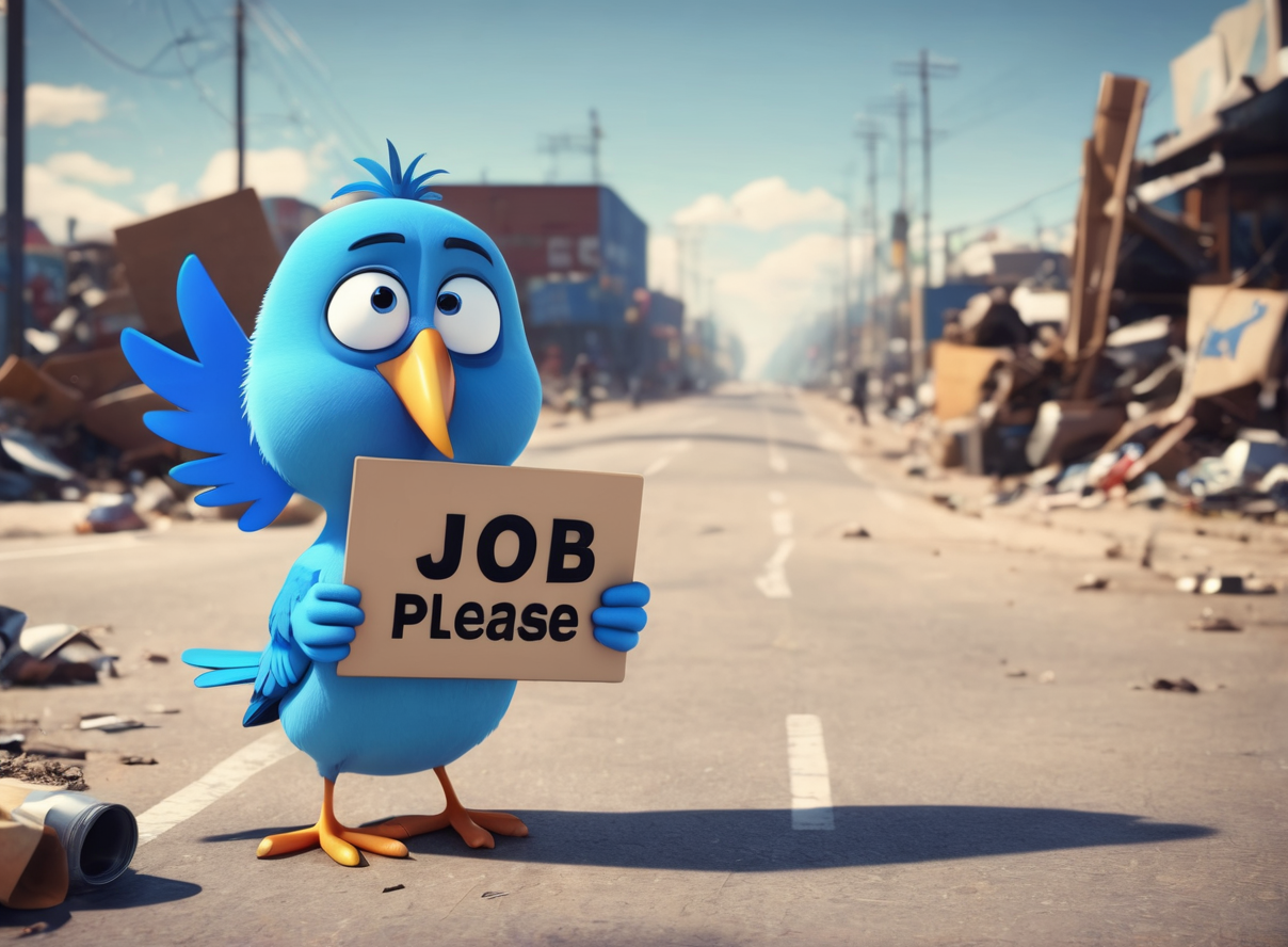 homeless depressed sad tired expression blue twitter bird with beard holding a sign displaying text of "job please!", cartoonish render, 3d render, street junkyard, cartoon pixar