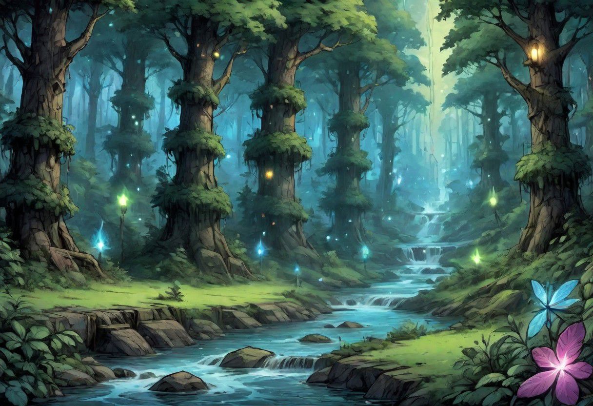 comic book art, epic fantasy, splash art, a mystical magical lush forest, will-o-the-wisps, sprites, fairies, (magic lights, magic effects, magic sparkles, magic swirls:1.5), magical flowers, a waterfall, glitter, peaceful, serene, nighttime