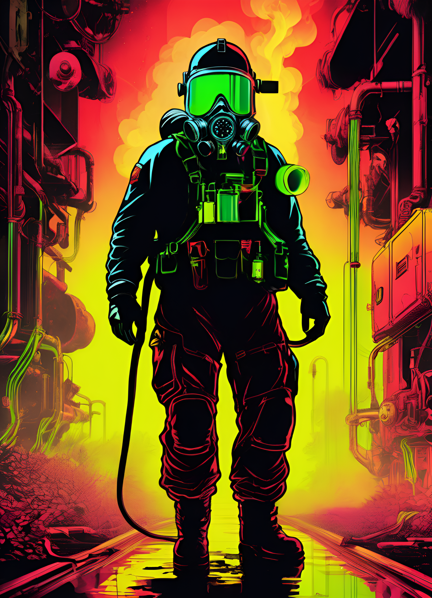 ValvePunk,1 man at Poison gas leakage site,helmat,smoke and fog,leaking liquid and bubbles,yellow warning line, Indirect light,Lime green and red neon hue,anaglyph filter, masterpiece,hyperdetailed,8K,wallpaper,epic composition,