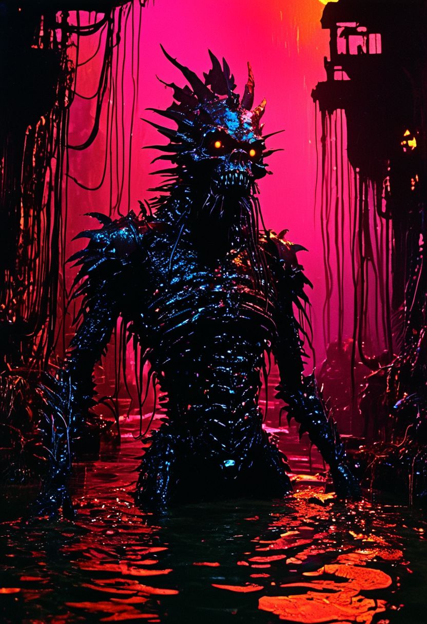 Ancient underwater animatronic mechanical monster with decaying rubber flesh, dark murky water, VHS screen grab, nostalgic, old 80s found footage silhouette , in the style of the decaying empire of Wrstreich, dark magic and grotesque creatures abound, inspired by Sean Aaberg's punk aesthetic, dark fantasy world combines grim landscapes with vibrant, exaggerated neon colorful art, old 80's VHS dark fantasy, VHS screen grab, grainy, old footage