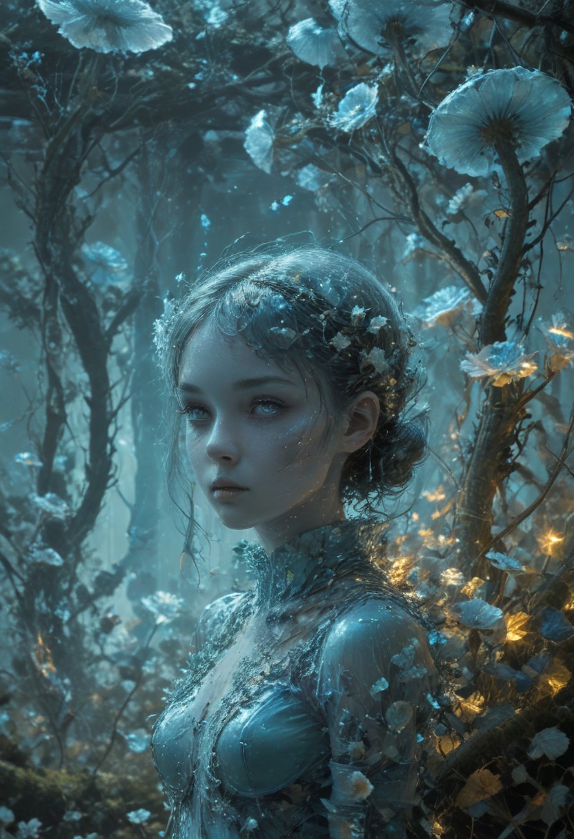 Alice from Alice in Wonderland inside a bioluminescent gigantic pale blue glowing flowers tron_legacy_neon_maze made as mushrooms in wonderland, creepy, horror, scary, soft lighting, sharp focus, by Marc Simonetti & Yoji Shinkawa & WLOP, paint drops, rough edges, trending on artstation, studio photo, intricate details, highly detailed, <lora:Bio-Luminescence:0.6>, <lora:add-detail-xl:0.7>, <lora:xl_more_art-full_v1:1>,