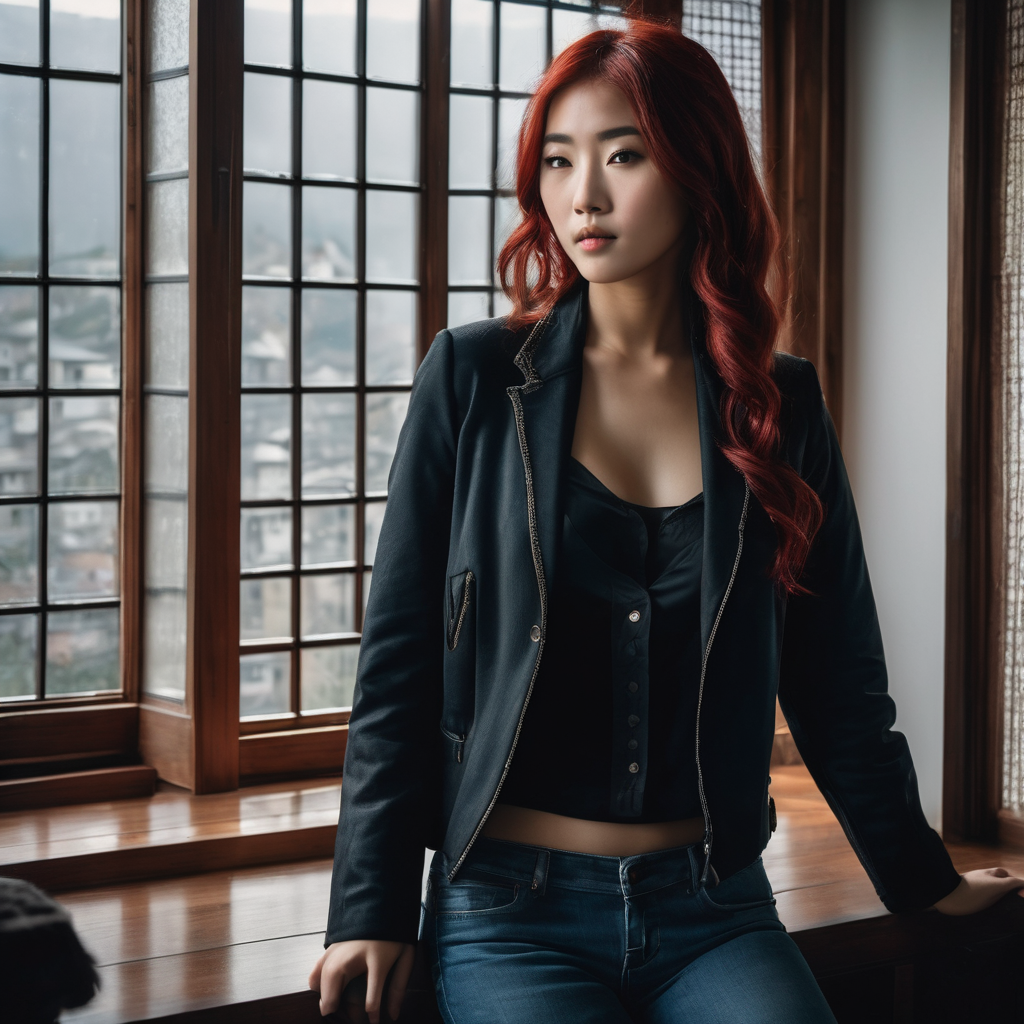 realistic photograph of a 20yo mixed japanese 1girl with red hair, open black jacket, red bra, inside house, in front of large window best quality, high quality, dark, blue rim lighting highly detailed, intricate