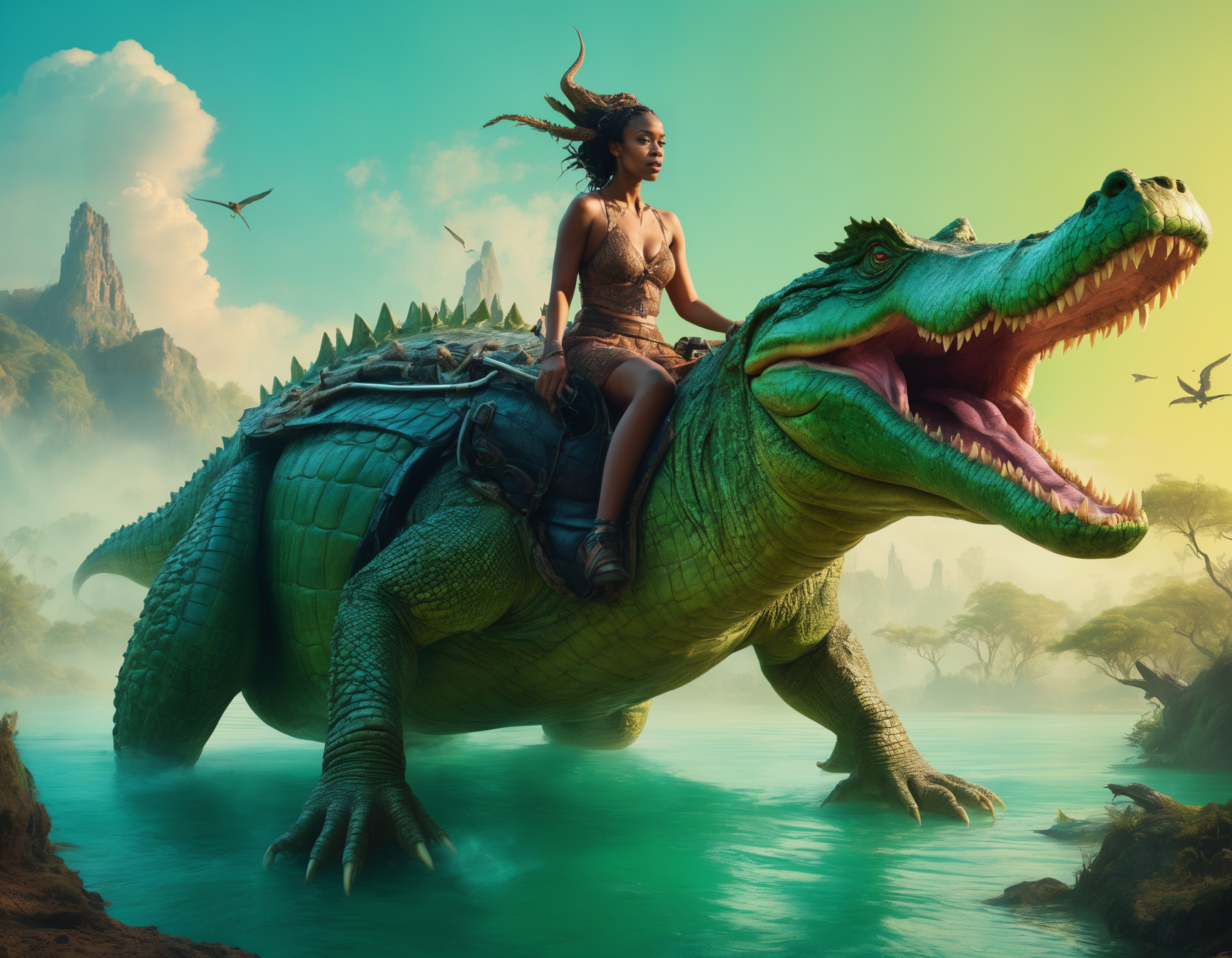 caustics, trending on CGSociety, fluorescent green sky, High quality, surreal, intricate details, [Brilliant:Shabby:20] Moody large Prehistoric Female Orsimer riding a Crocodile, Terrifying Chignon hairstyle, HDR, Bright design, Cutecore
