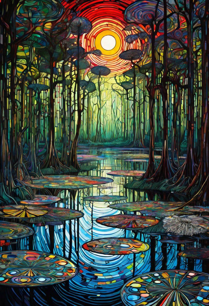 psychedelic Swamp,Stanley Donwood, stained glass, Klimt, Junji Ito, stylized, pattern, soft, dynamic lighting,