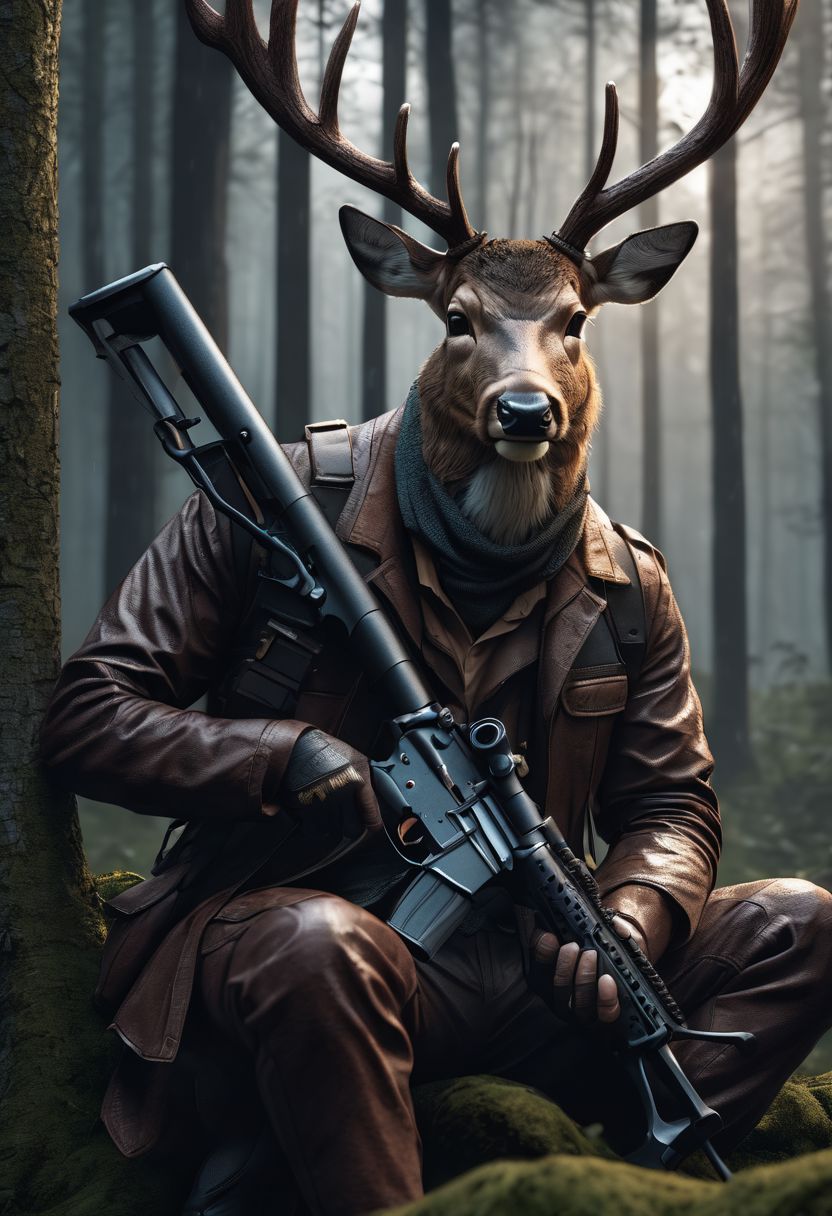 (humanoid deer), sitting in the forest against a tree, hunter's clothes, aiming a soft-air-rifle, evening, dusk light, raining, heavy rain, dark colors, hyperrealistic, 8k, very detailed, realistic shadows, unreal engine 5, filmgrain