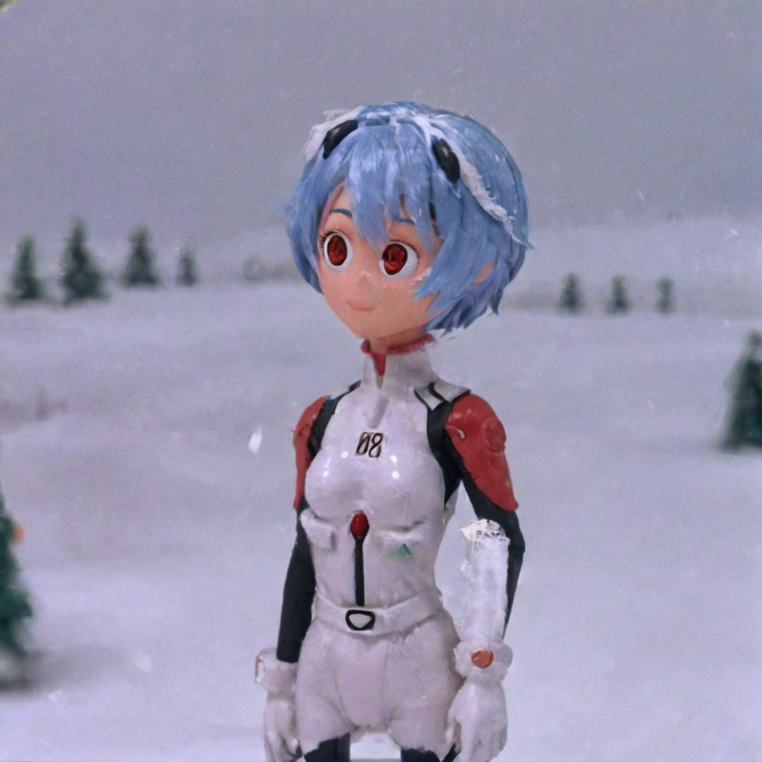 (solo) claymation puppet ayanami rei, short blue hair, white plug suite, headgear, short hair, red eyes, snow, blue moon, grabbing own arm, RTRNR <lora:Rudolph_the_Red_Nosed_Reindeer_Film_Style-000009:0.8> <lora:AyanamiRei:0.7>