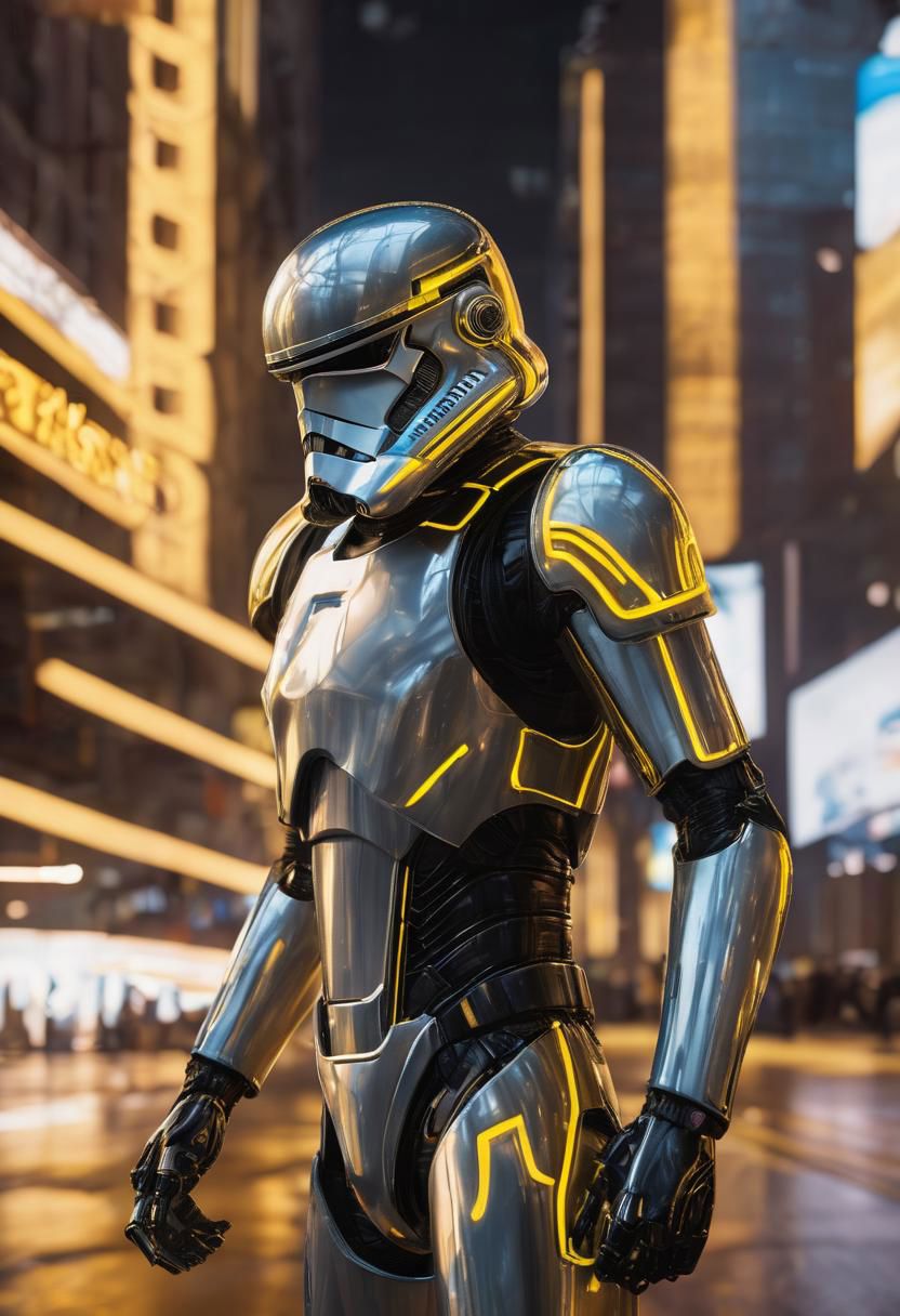 Stormtrooper in TRON style black and yellow glowing bodysuit in computer themed city. 8K resolution Unreal Engine 5