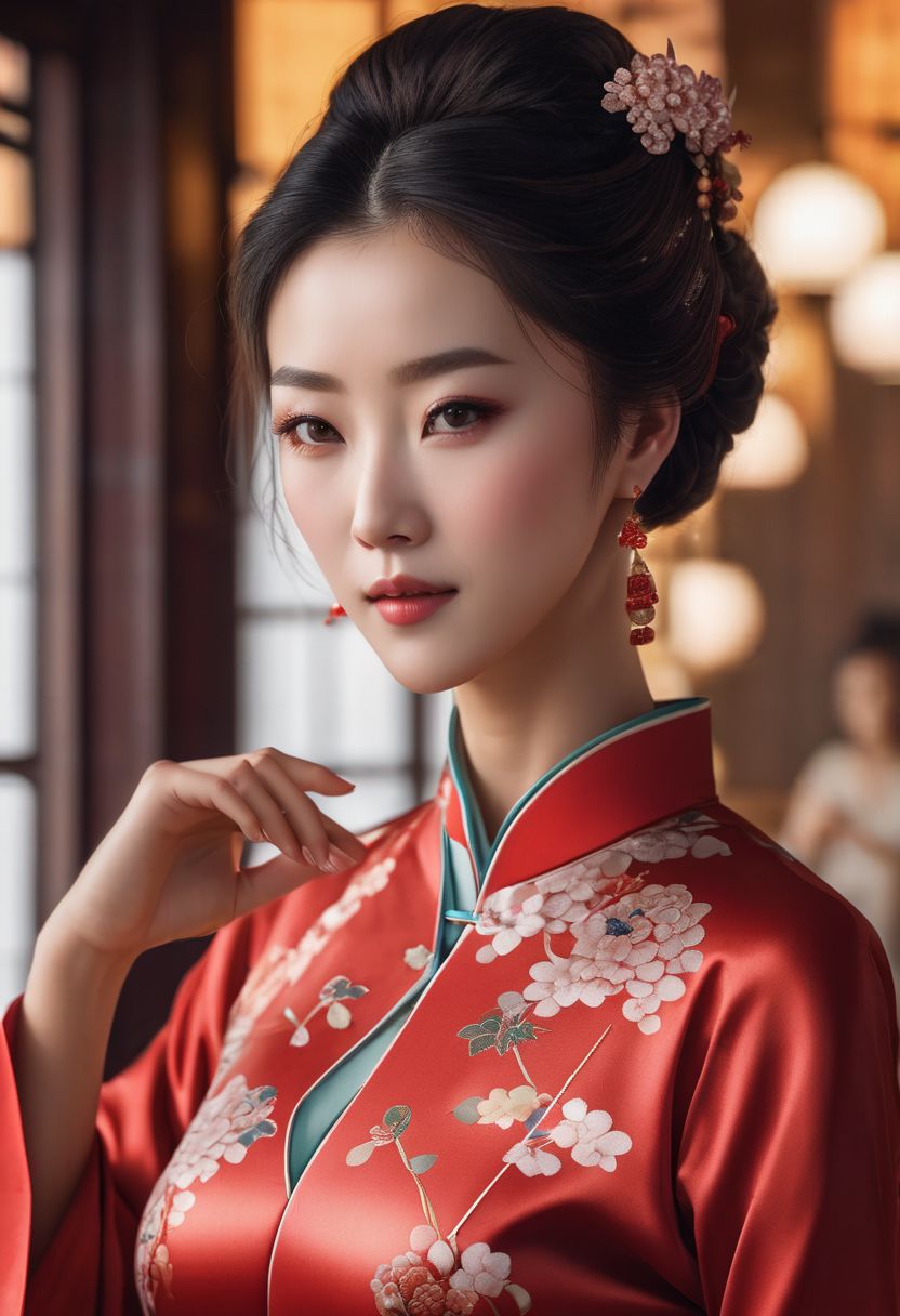 a Chinese woman wearing a cheongsam, (((masterpiece))),((best quality)),((intricate detailed)),((Hyperrealistic)),absurd res,milf,mature woman,perspective,highly detailed,illustration,1girl,((large breasts)),perfect hands,detailed fingers,beautiful detailed eyes,updo hair,brown eyes,(chinese dress:1.2),earrings,detailed background,perfect eyes,seductive eyes,looking at the viewer,from front,<lora:tangbohu-line_1.0:1>,