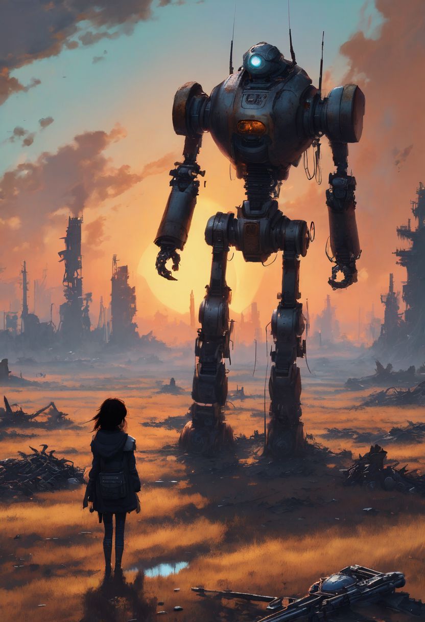 seen from behind, a little girl (holds the hand:1.5) of a very rusty broken robot (from behind:1.5), they are on the remains of a battlefield and looks in the distance at the sun which sets on the corpses of ennemy robots, sad picture,