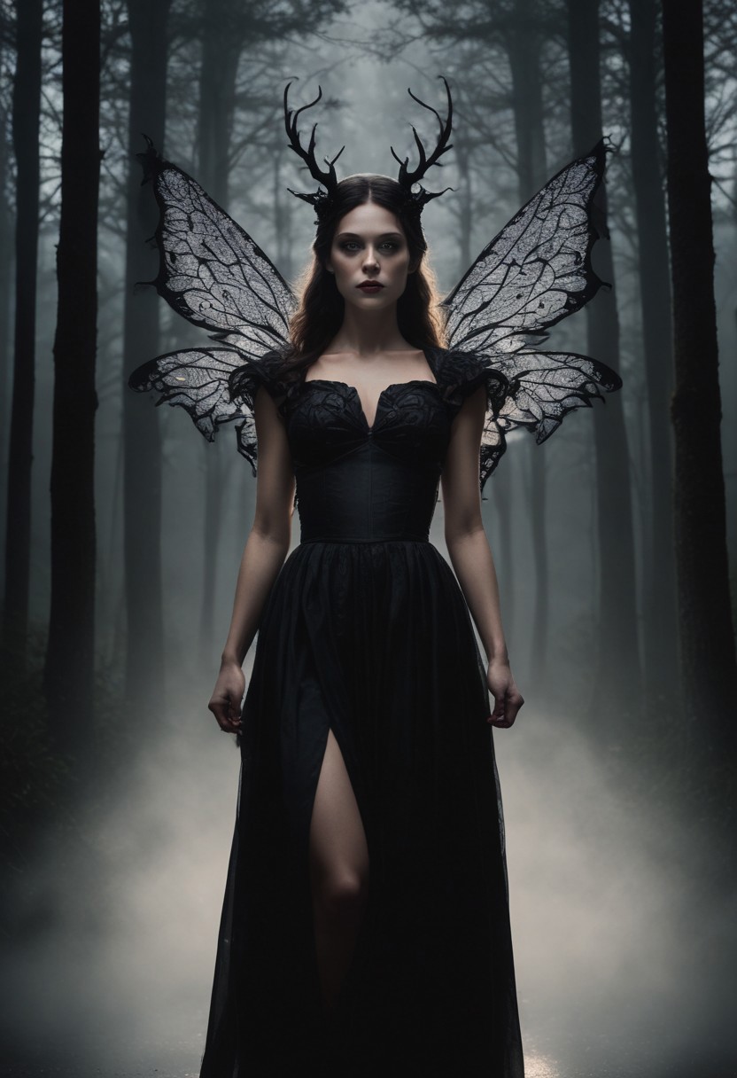 8k model photography of a young faerie wearing wearing a black dress of shadows and darkness, dreamy and surrounded by darkness and shadows during a dark moonless night