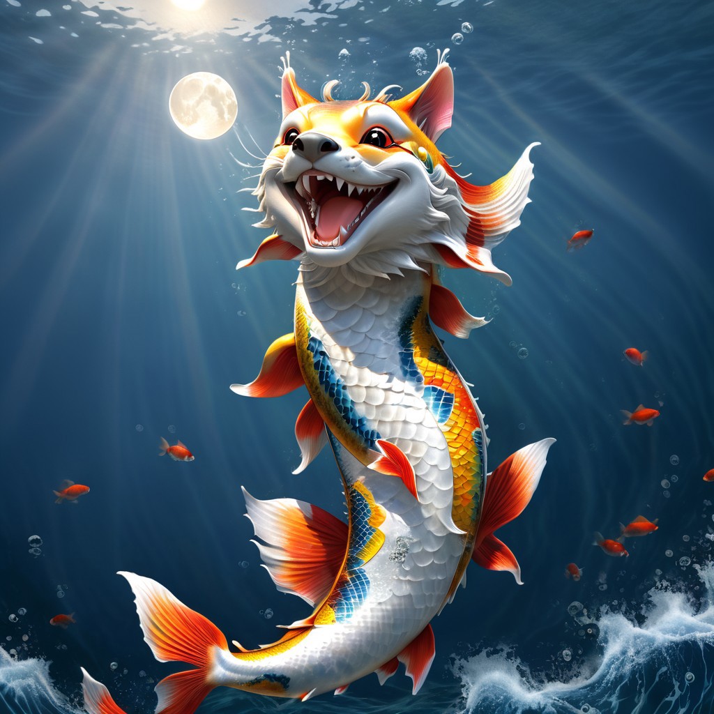Score_9, Score_8_up, Score_7_up, Score_6_up, Score_5_up, realistic lighting and shadows, incredibly beautiful and detailed background: 1.1, sleek, slim, joyful, female, rainbow wolf, fangs showing as she smiles and straddling the top of a silver classic Japanese koi fish with flowing elaborate elegant fins , fish is leaping out of the ocean under a full moon